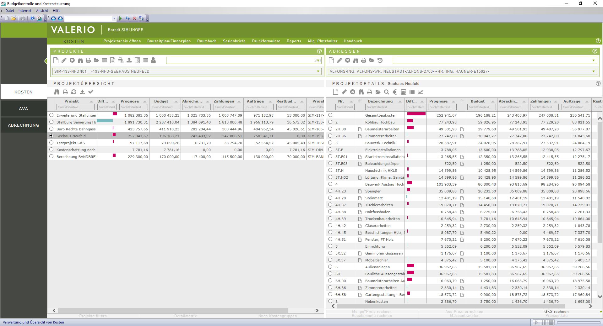 Sie erhalten die Kostendetails mit einer Darstellung der Kostenstellen in der linken Bildschirmhälfte und den zu jeder Kostenstelle zugehörigen Details, den Teilgewerken, in der rechten Bildschirmhälfte.