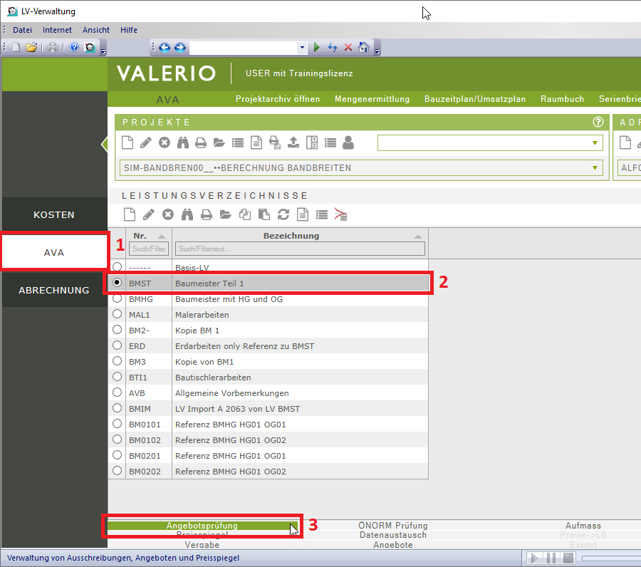 Starten Sie nun die Angebotsprüfung, in dem Sie im Modul AVA zunächst das betreffende LV auswählen und dann im unteren Bereich den Button „Angebotsprüfung“ anklicken.