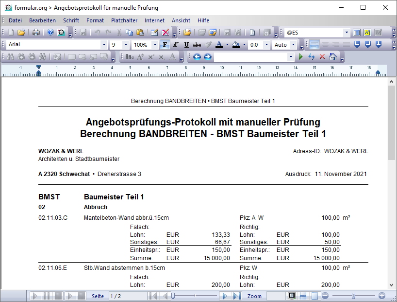 Mit klicken auf den „OK“-Button erscheint nun am Bildschirm ein Angebotsprüfungs-Protokoll. Wurden die Angebotspreise manuell eingegeben steht in der Überschrift manuell dabei. Dieses Angebotsprüfungs-Protokoll kann nun z.B. als pdf-abgespeichert werden.