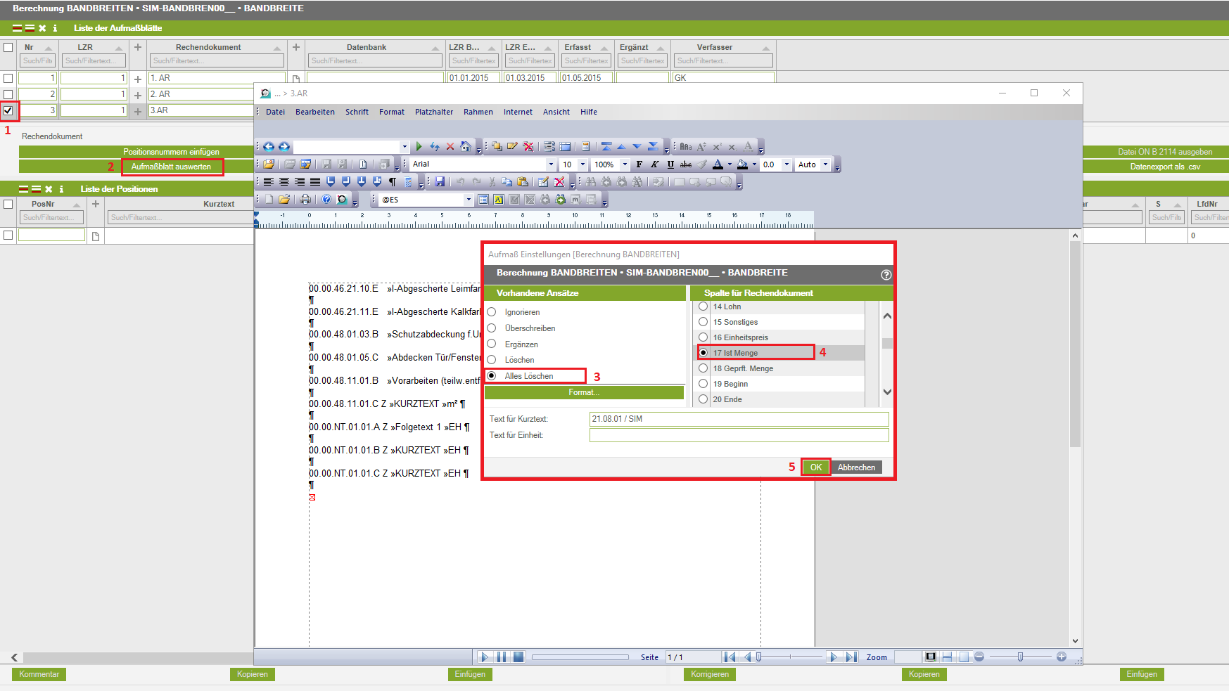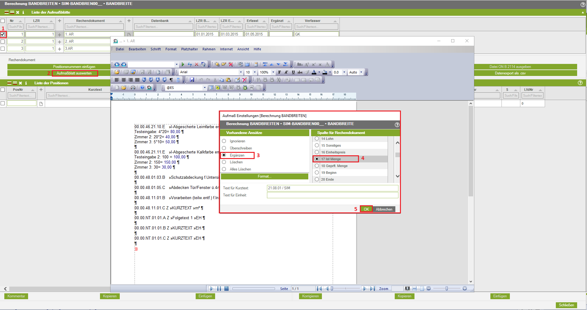 Wenn Sie die Aufmaße von einem Aufmaßblatt neu in das Rechendokument der LV-Menge übertragen möchten, müssen Sie das Aufmaßblatt „auswerten“. Markieren Sie das betreffende Aufmassblatt und klicken Sie also auf den Button „Auswerten“ in der Menüzeile zwischen der Liste Aufmaßblätter und der Postionsliste des ausgewählten Aufmaßblattes (vgl. Screenshot unterhalb). Dort „ergänzen“ Sie die Ansätze in die Spalte 17 „IST-Menge“ hinein und klicken Sie dann zum Durchführen auf „OK“.