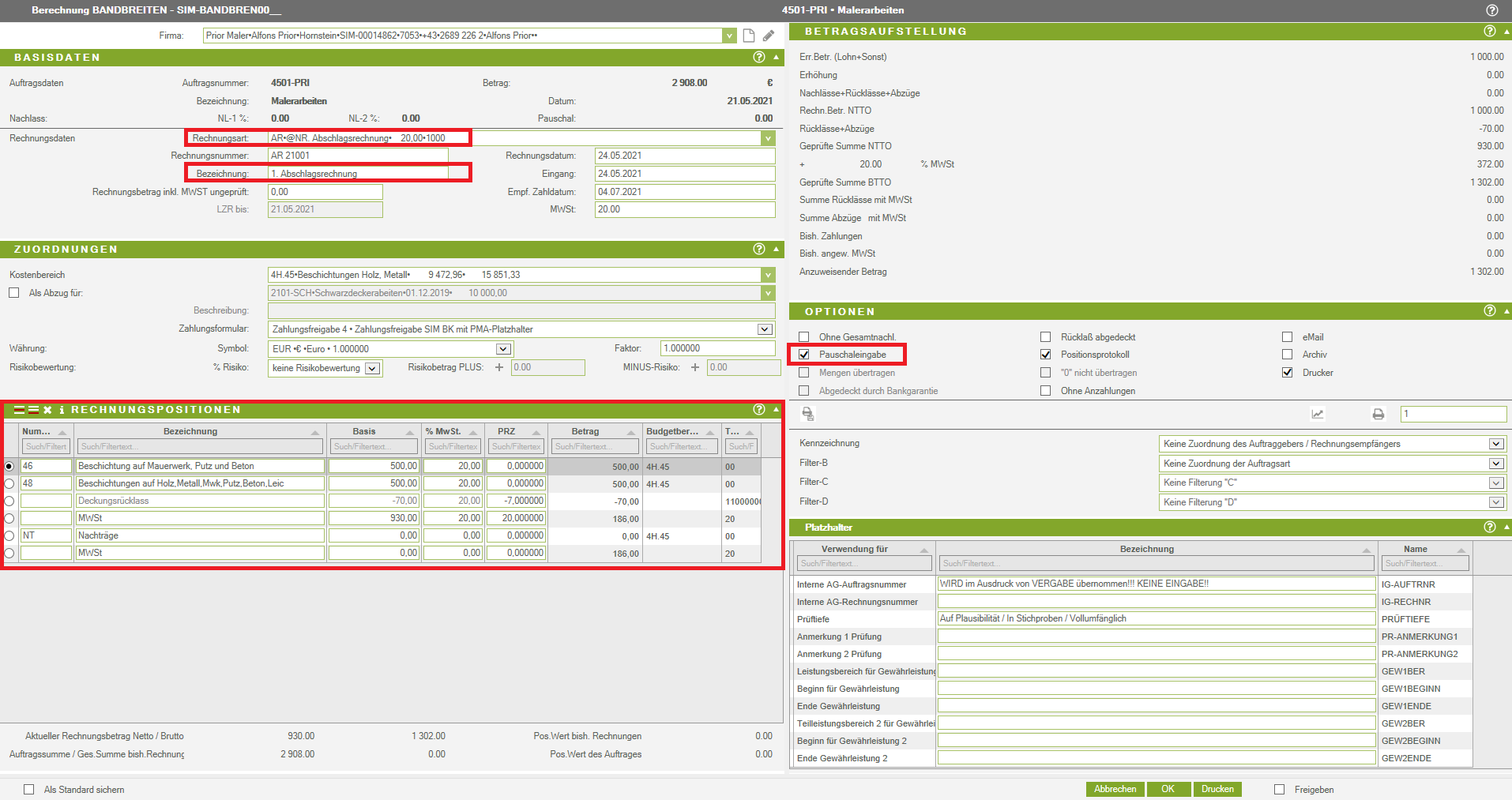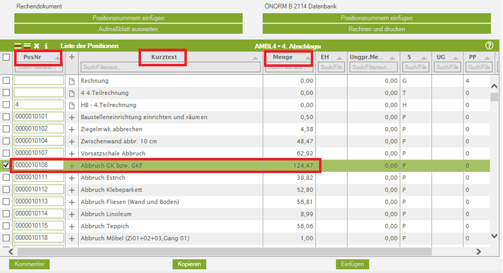 Anmerkung: Ergänzen Sie die Ansätze in die Spalte 18 „geprüfte Menge“ erst, wenn es sich um eine Schlussrechnung handelt.