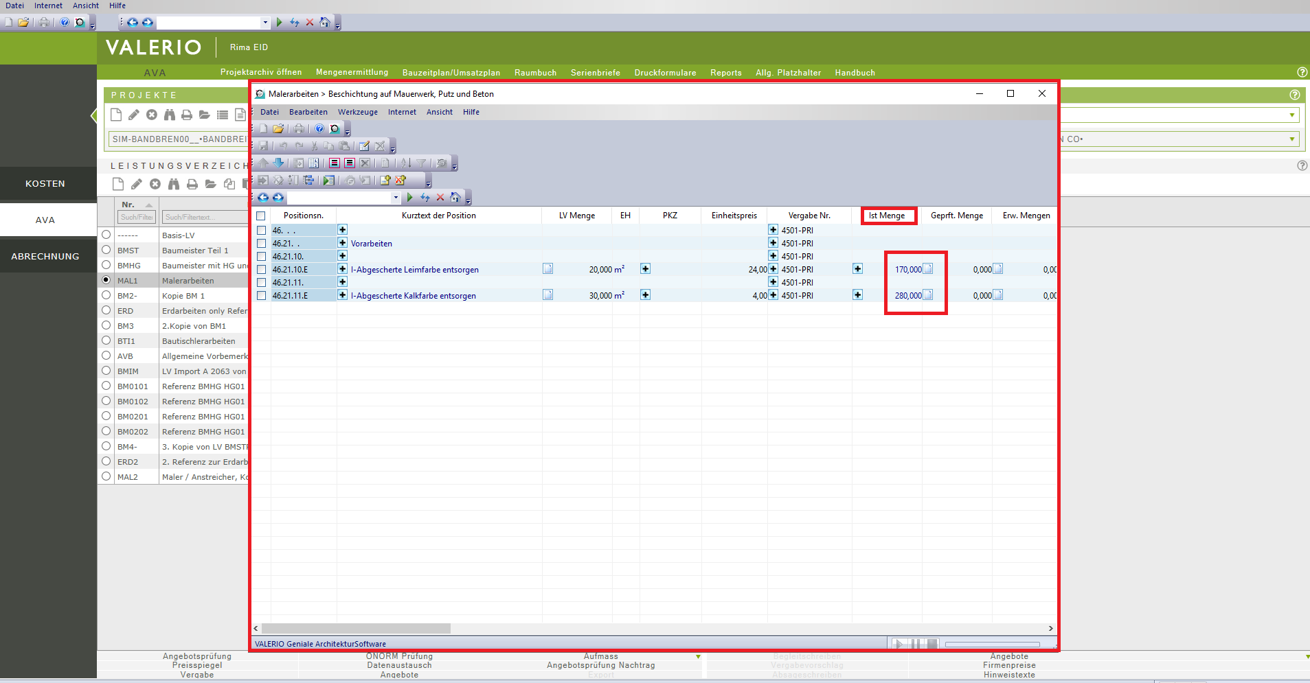 Zur Kontrolle, gehen Sie zum Modul AVA und Öffnen die Positionslisten der Leistungsgruppen des zugehörigen Leistungsverzeichnis. Die IST-Menge sollte für alle Positionen auf den Wert Null gesetzt worden sein.