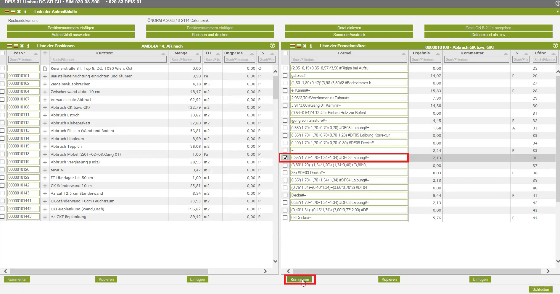 Durch Korrekturen können Sie die (ÖNORM B 2114 und A 2063) Aufmaßblätter von den Firmen im Fall eines Fehlers korrigieren.