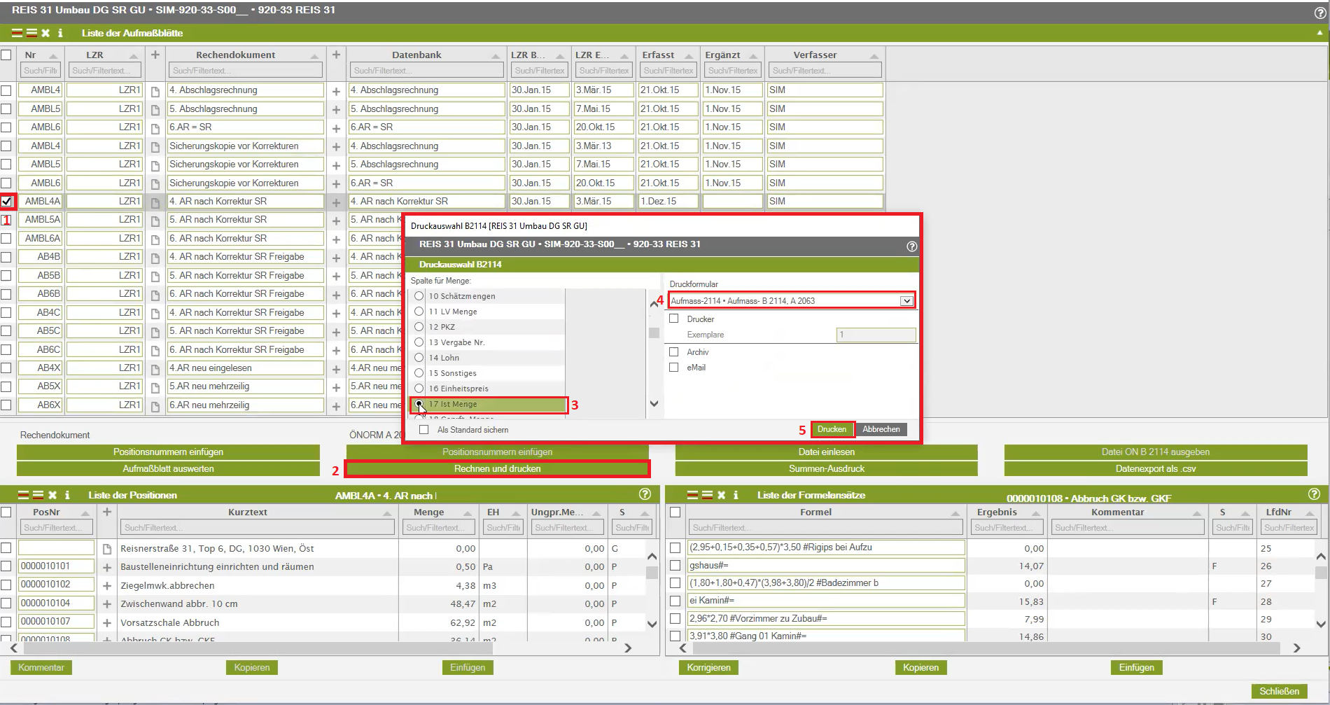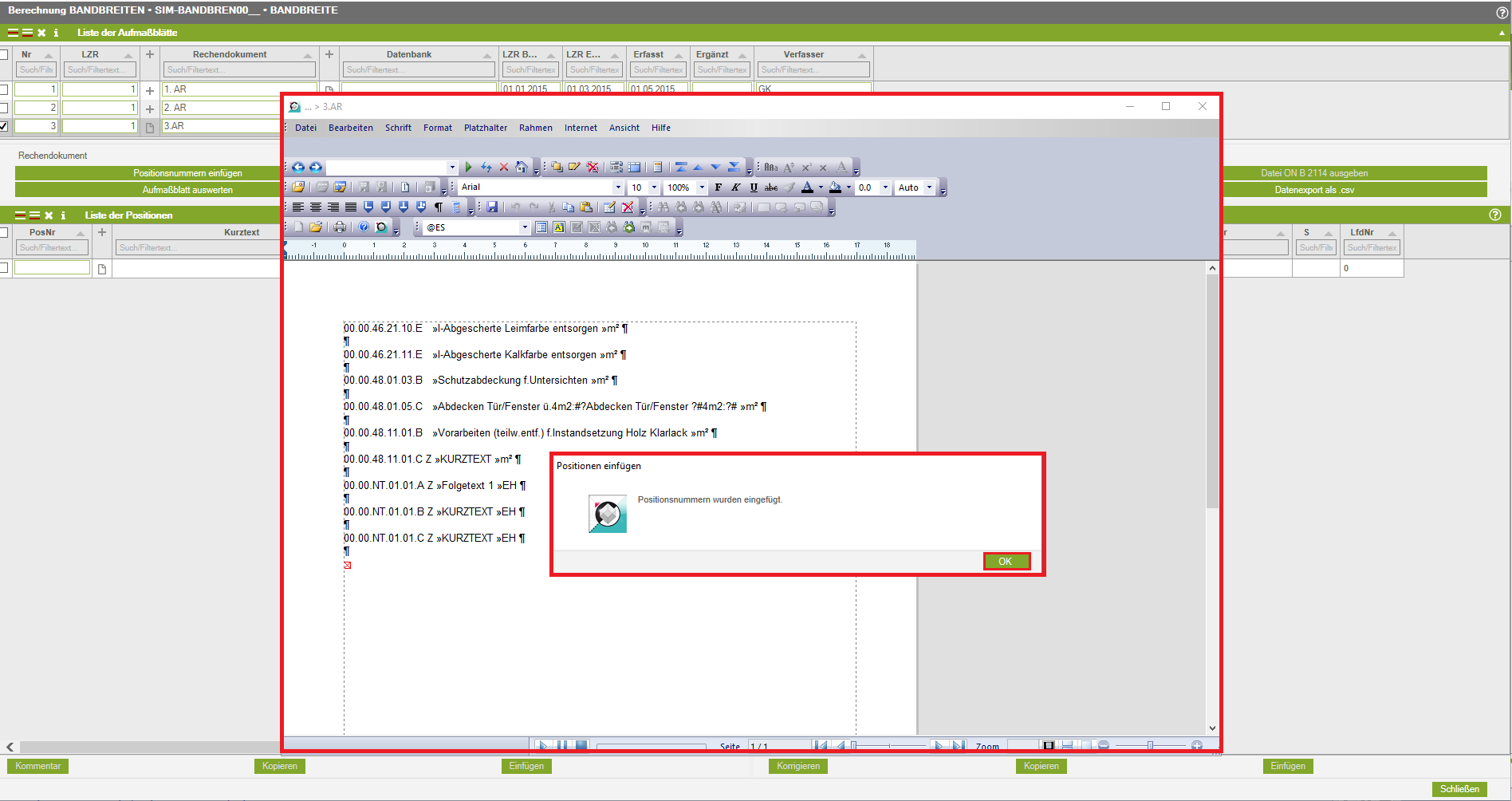 Zur Kontrolle gehen Sie bei den Leistungsgruppen in die Positionslisten hinein. Öffnen Sie das Rechen-Dokument in der Spalte „IST-Menge“. Die Aufmaße sollten übernommen worden sein.