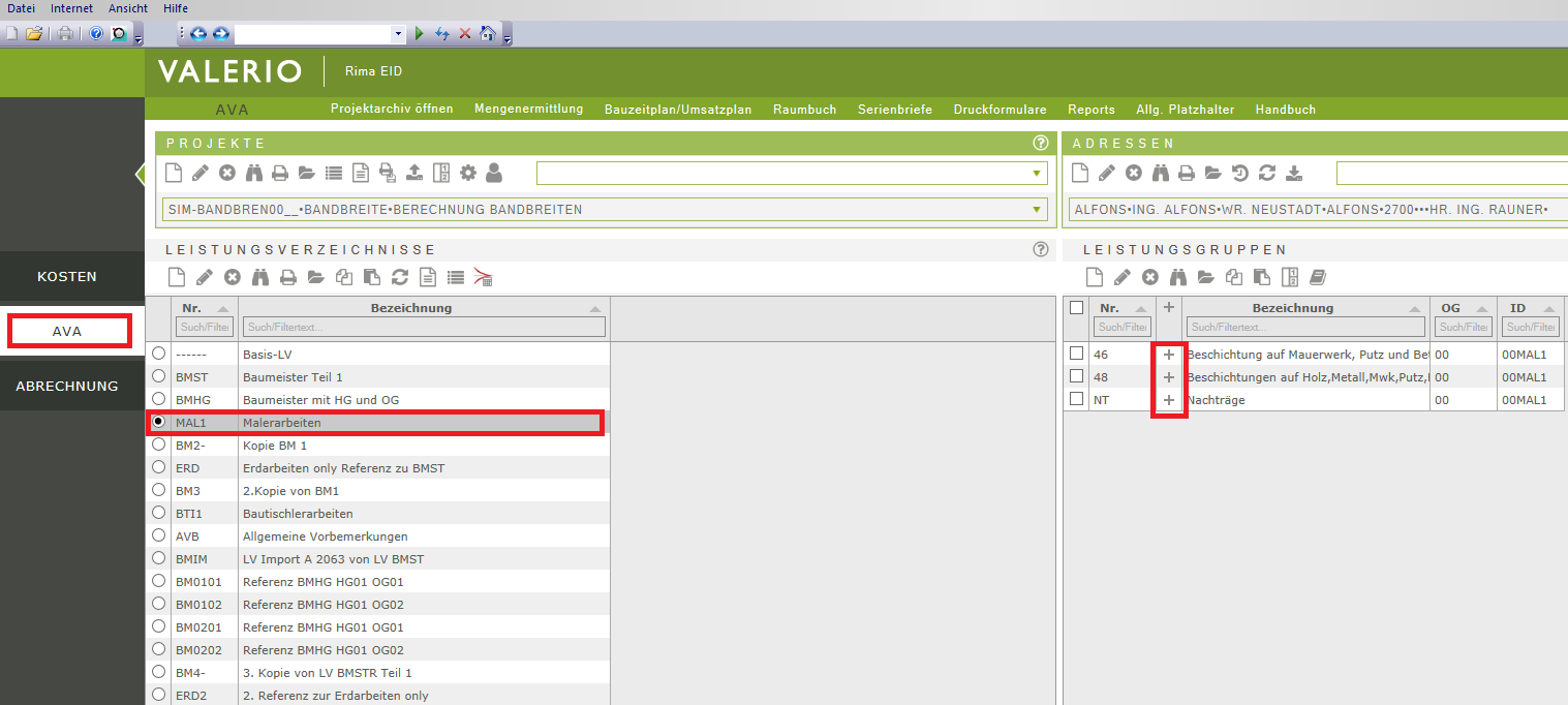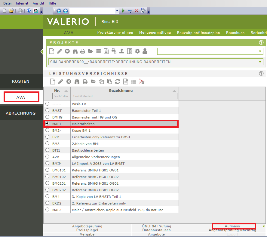 Nachdem Sie das gewünschte Projekt geöffnet haben, gehen Sie in das Modul AVA, wählen Sie ein Leistungsverzeichnis aus z.B.: wie im Bild unterhalb Malerarbeiten.