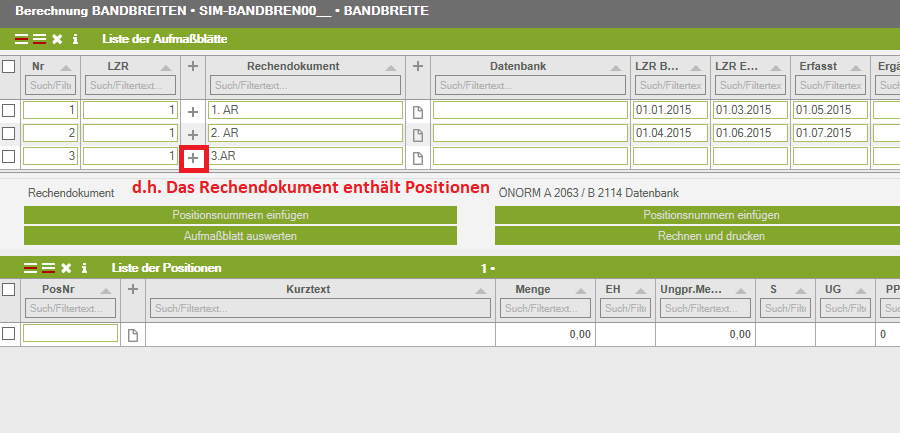 Gehen Sie zum Bereich Aufmaßblätter und wählen Sie ein Aufmaßblatt aus. Durch klicken auf das Plus-Symbol in der Zeile des Aufmaßblattes, in der Spalte zwischen den Spalten Rechendokument und Datenbank, werden nun in der Positionsliste darunter die Positionen des Aufmaßblattes ausgegeben.