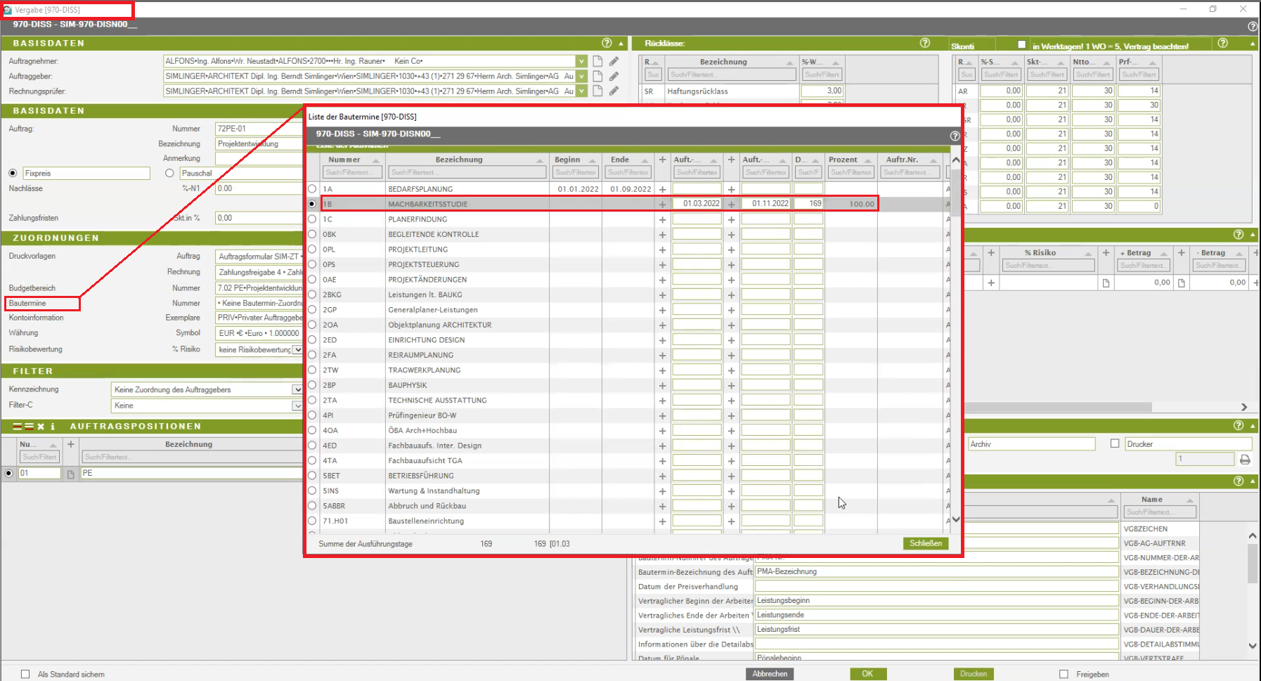 Setzen Sie die Zuordnung der Bautermine in den Auftragseinstellungen ein (vgl. Bautermine mit Auftrag erfassen).
