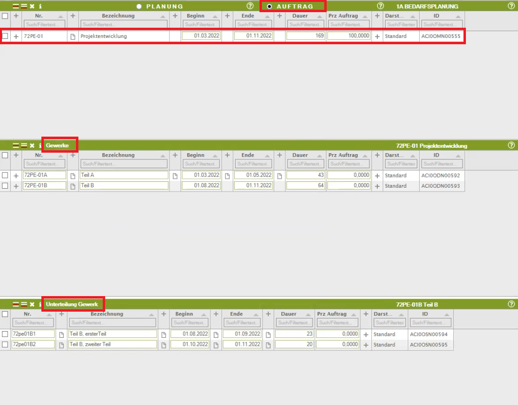 Sie können den Auftrag auf mehrere Unteraktivitäten aufteilen (wie im Beispiel, Ebene 1 „Gewerke“ und Ebene 2 „Unterteilung Gewerk“).