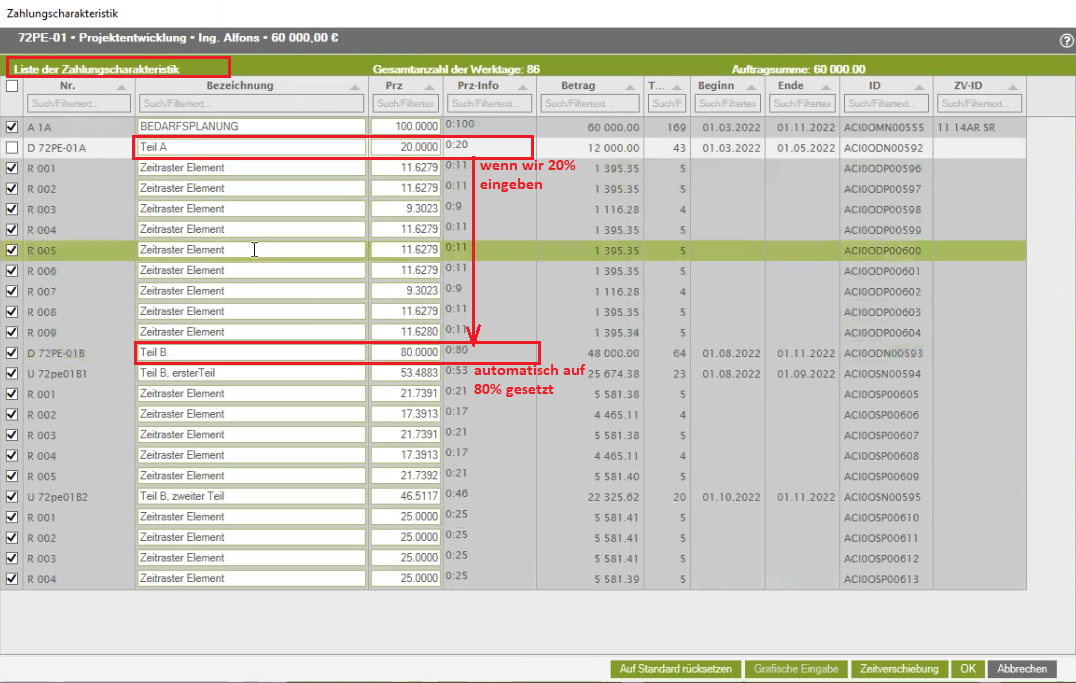 Dieses Fenster sollte angezeigt werden. Über das „+“-Zeichen links in der Zeile des Auftrags können Sie die Zuordnung des Auftrags zu Zeitraster elementen vornehmen/anpassen. Danach schließen Sie das Fenster mit der Zahlungscharakteristik wieder.