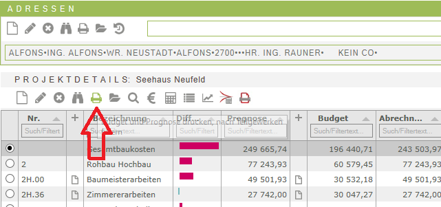 Eine Übersicht der Rechnung erhalten sie beim Ausdruck der Kostenkontrolle. Gehen sie dazu ins Modul Kosten und klicken Sie rechts auf das Drucker Symbol (Achtung, es gibt 2 Druckersymbole im Menü, wählen Sie bitte das Linke).