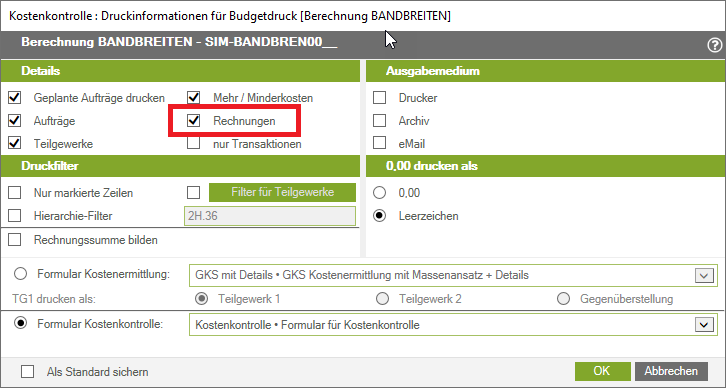 Bei dem nun folgenden Dialogfenster zu den Druckoptionen setzen Sie bitte ein Häkchen bei „Rechnungen“.