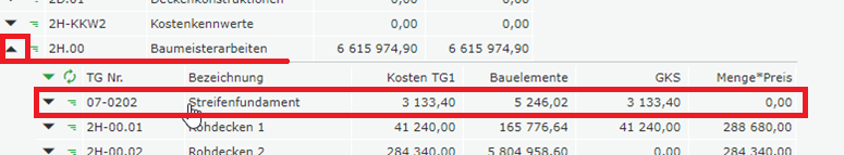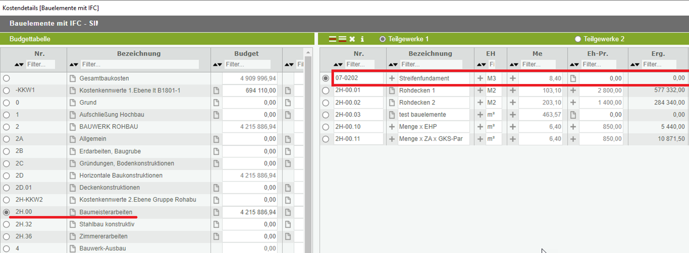 Zunächst wird ein Teilgewerk angelegt. Im Beispiel wird bei 2H.00 Baumeisterarbeiten ein neues Teilgewerk 07-02.02 Streifenfundament angelegt.