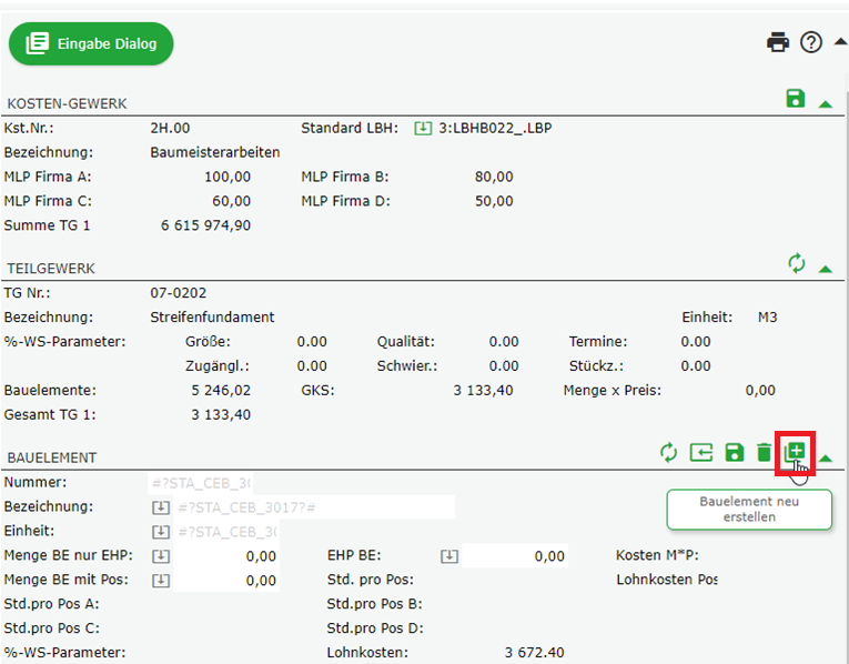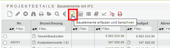 Dazu erfolgt die Erstellung eines Bauelements in der Maske Bauelemente. Diese können Sie im Modul Kosten mit dem entsprechenden Icon aufrufen.