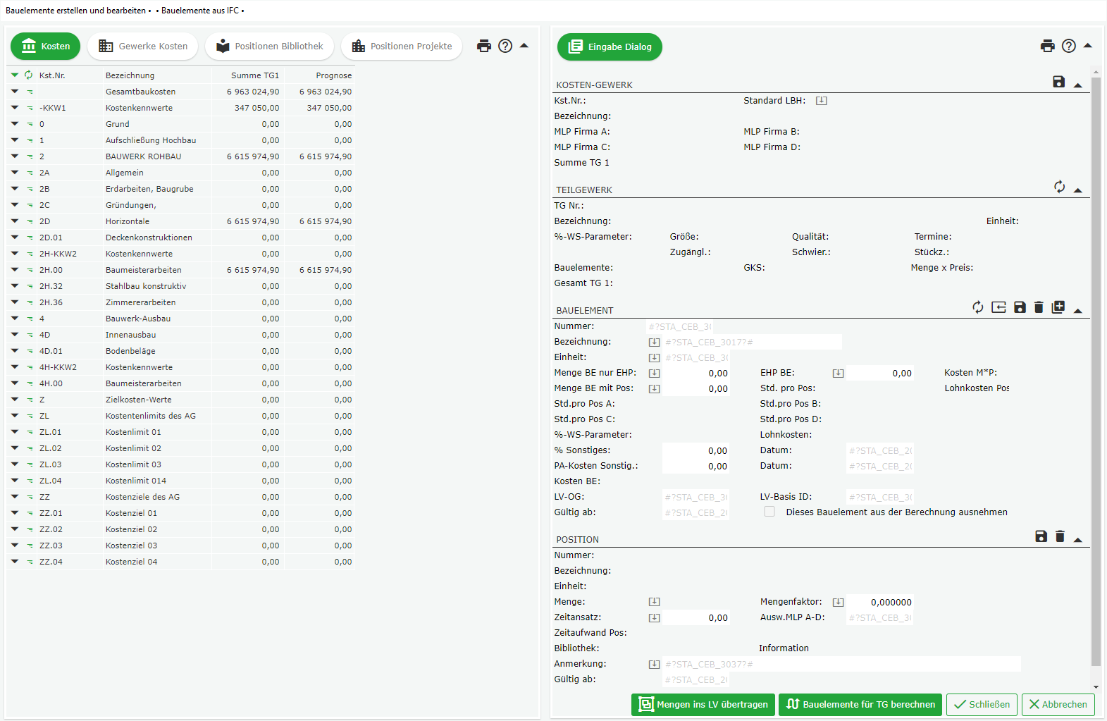 Über sogenannte Bauelemente lässt sich eine Verbindung zwischen den Teilgewerken der Kostenprognose und den Leistungsverzeichnissen herstellen (auch unter Berücksichtigung von Projektvariablen wie beispielsweise Mengenermittlungen mittels IFC Import).