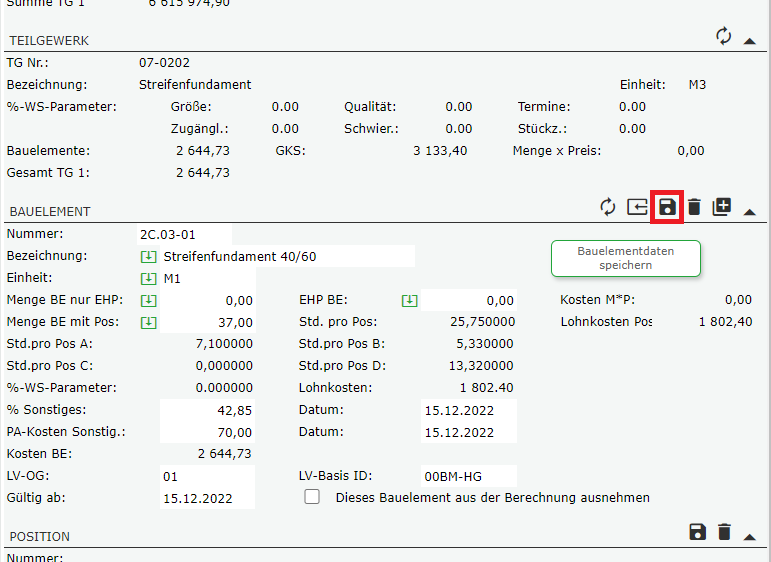 Haben Sie Daten für alle Positionen eines Bauelements erfasst, befüllen Sie bitte noch die offenen Felder im Bereich des Bauelements.