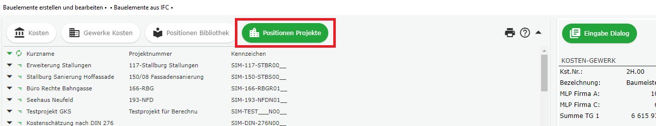 Nun soll dem Bauelement eine LV bzw. mehrere LV-Positionen zugewiesen werden. Dazu gehen Sie in den Linken Bereich und klicken Sie links oben auf „Positionen Projekte“.