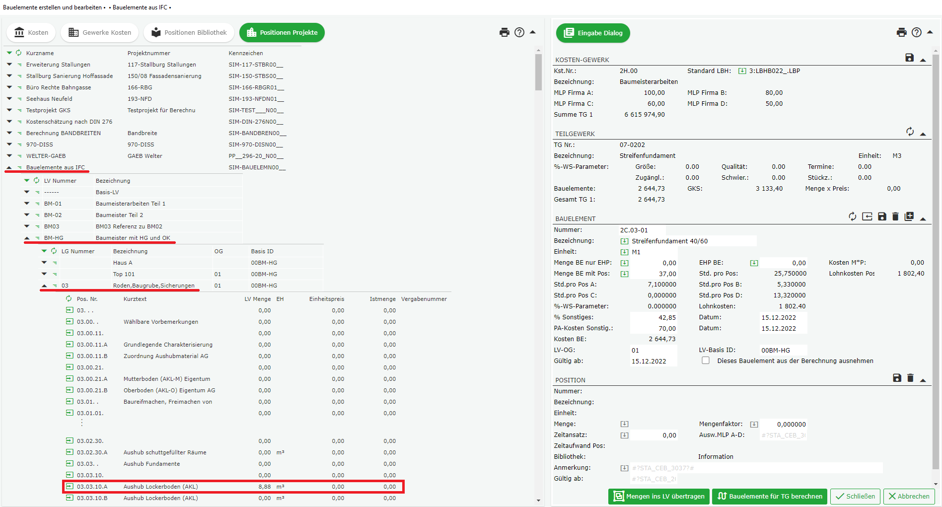Wählen Sie auf diese Weise alle LV-Positionen, die für das Bauelement relevant sind.