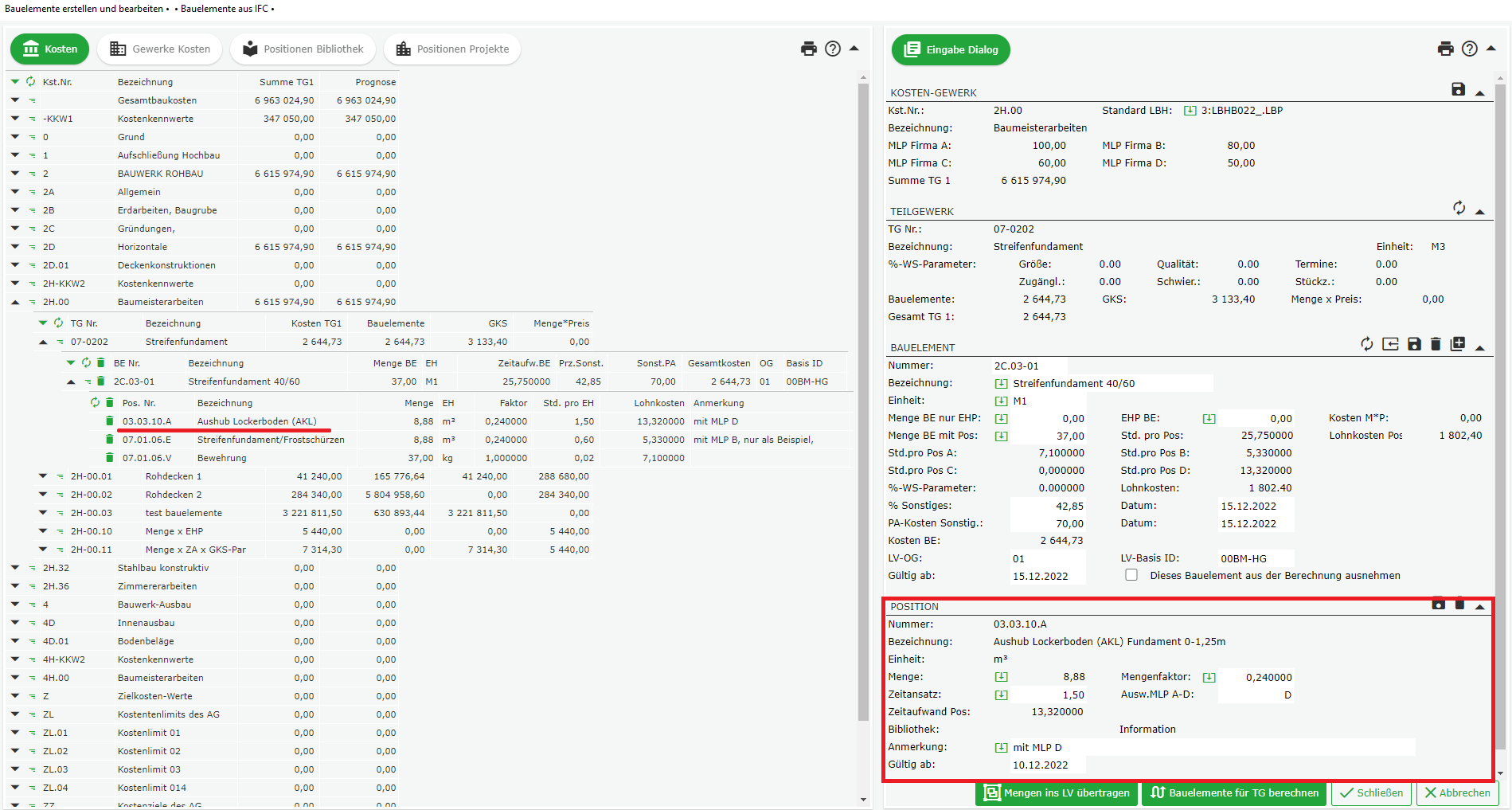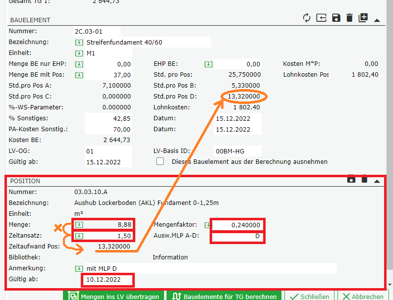 Der Zeitaufwand für die gesamte Position wird dann automatisch ermittelt und in das Bauelement übertragen.
