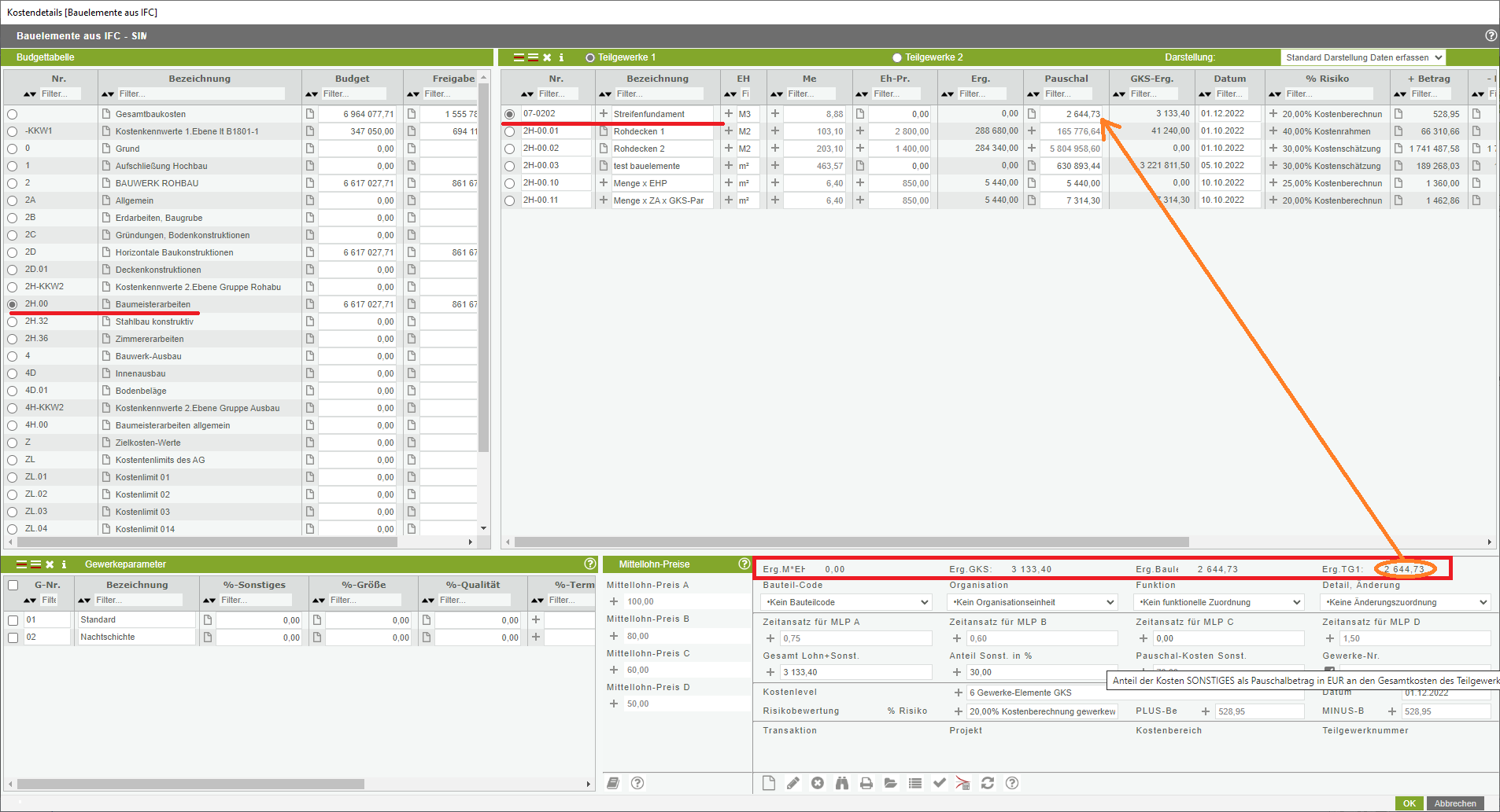 Zur abschließenden Kontrolle verlassen Sie nun das Fenster Bauelemente und schließen es mit Button Schließen rechts unten. Öffnen Sie nun die Budgettabelle/Kostenstellenliste und wählen Sie dort das betreffende Teilgewerk aus. Im Bereich rechts unten werden nun in der ersten Zeile die ermittleten Kosten nach den verschiedenen Ermittlungsmethoden angezeigt. Bei Erg.M*EP steht das Ergebnis aus Menge x Einheitspreis, bei Erg.GKG steht das Ergebnis der Gewerkekostenschätzung (Menge x Zeitansatz x Gewerkeparameter + Sonstiges) und bei Erg. Baule steht das Ergebnis der Kostenermittlung aus Bauelementen (Positionen x Menge x Zeitansatz x Gewerkeparameter + Sonstiges). Ganz rechts als 4. Wert bei Erg.TG1 steht das von Valerio für die weitere Berechnung herangezogene Ergebnis (es wird das jeweils höherwertig ermittelte Ergebnis verwendet). In unserem Beispiel sollte dort nun der eben mit den Bauelement neu ermittlte Wert aufscheinen.