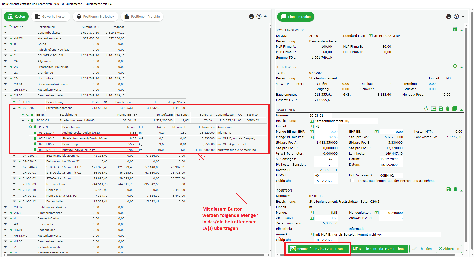 Die mit Bauelementen erfassten Mengen lassen sich auch in das bzw. die betroffenen LVs übertragen. Allerdings nur einzeln je Teilgewerk, wobei ein Teilgewerk, wie oben erklärt, durchaus aus mehreren LV-Positionen bestehen kann und für alle erfassten LV-Positionen des Teilgewerks eine Übertragung stattfindet.