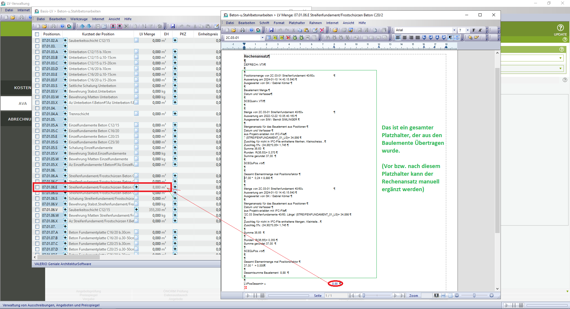 Bei der Übertragung von Mengen von Bauelementen in LVs werden nicht nur das Ergebnis der Mengenberechnung sondern das gesamte Rechendokument ERGÄNZEND in das Rechendokument der Mengenermittlung der betroffenen Position des LV übertragen.Das Ergebnis sieht dann so wie in dem Beispiel unterhalb aus.