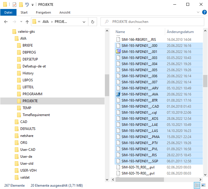Öffnen Sie den Windows Dateiexplorer und gehen Sie nun bei der Quellinstallation in das Verzeichnis „Valerio\AVA\PROJEKTE“ und lassen die Dateien in diesem Ordner nach Name sortiert anzeigen. Kopieren Sie nun alle Dateien, deren Namen mit dem exakten Projektkennzeichen beginnen (und mit verschiedenen Dateiendungen enden; Die Anzahl der Dateien kann dabei von Projekt zu Projekt variieren). Übertragen Sie diese Dateien (z.B. via USB-Stick, email, etc.) zum Computer mit der Zielinstallation. Fügen Sie dort diese Dateien wiederum im Verzeichnis „Valerio\AVA\PROJEKTE“ ein. Sie werden dabei gefragt, ob die bestehenden Dateien überschrieben werden sollen. Bejahen Sie die Frage.