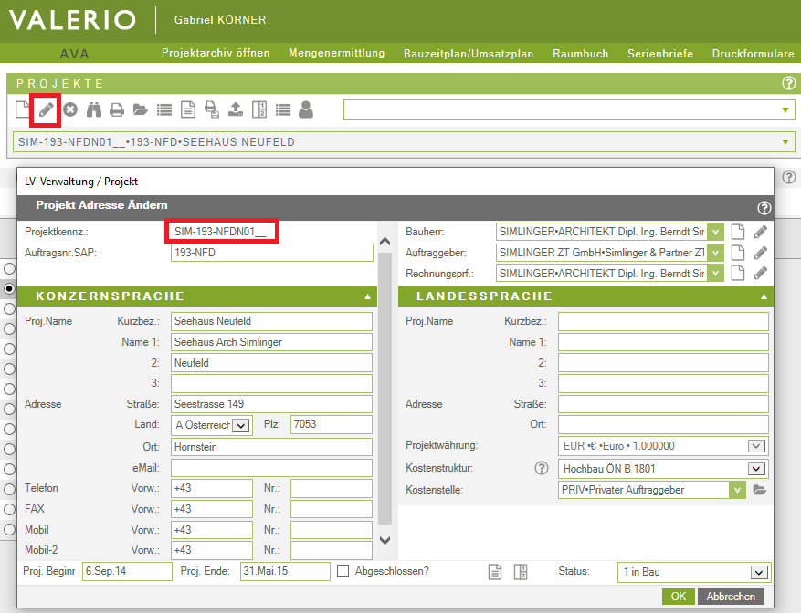 Legen Sie auf der Zielinstallation ein neues Projekt an und geben Sie diesem das selbe Projektkennzeichen (vgl. projekte-nomenklatur), welches das zu übertragende Projekt auf der Quellinstalltion hat. Am besten geben Sie auch in allen anderen Projektgrunddaten Feldern die selben Werte ein, die das Projekt auf der Quellinstallation hat. Danach schließen Sie Valerio.