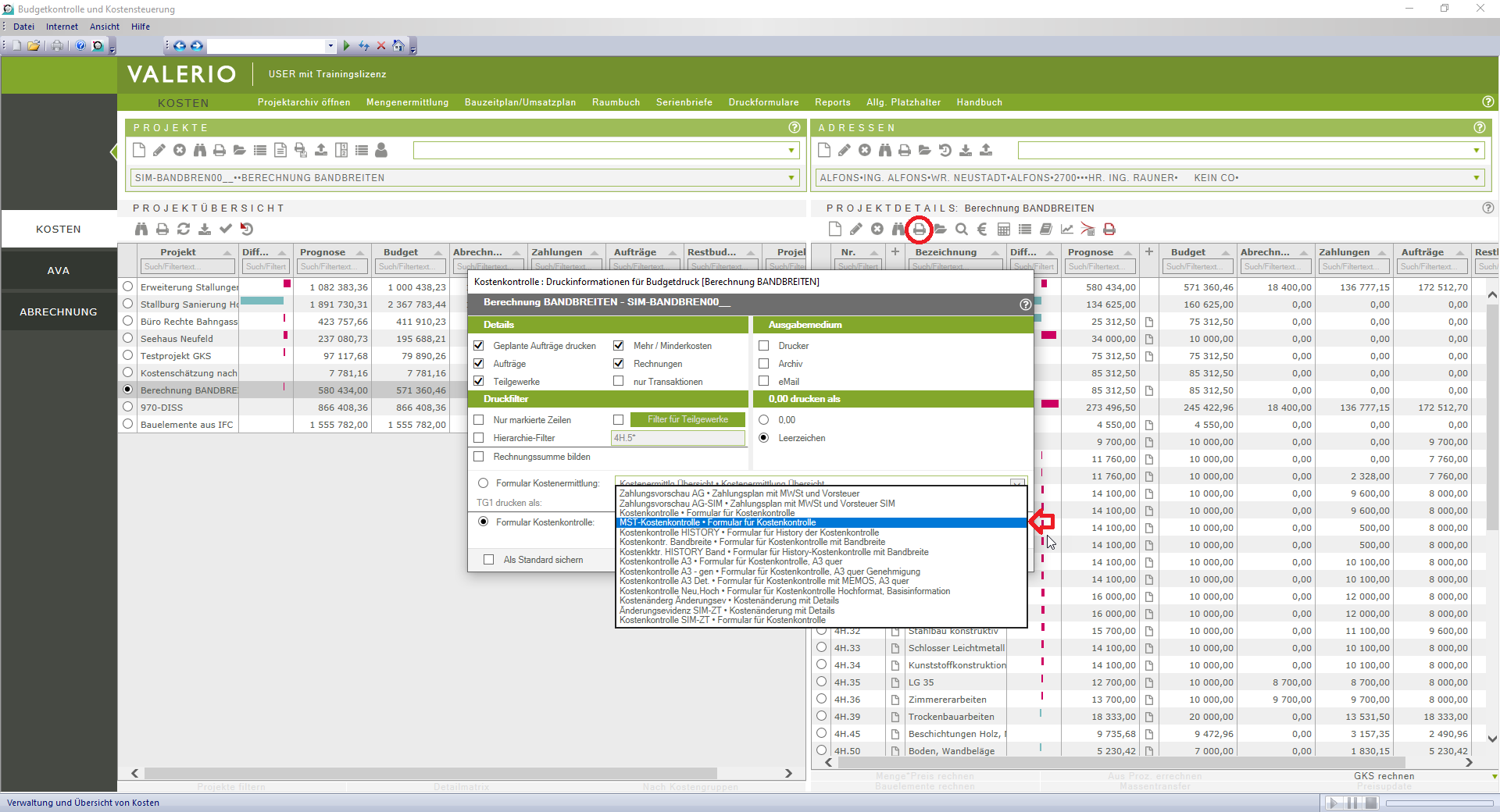 Nun bitte auf „Datei“ „speichern“ klicken und das Fenster schließen, ebenso die Druckformular Datenbank schließen. Um zu sehen, ob die Änderungen wie gewünscht aussehen, kann nun im Valerio Modul „Kosten“ das Symbol für Ausdrucke im rechten Bereich im Menü angeklickt werden. Das neu angelegte Druckformluar lässt sich nun unter Formular Kostenkontrolle auswählen.