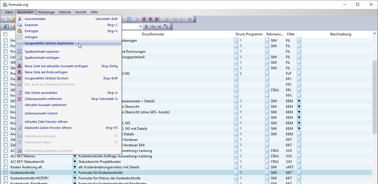 Als ersten Schritt wird das Vorlagedruckformular kopiert indem im Menü unter „Bearbeiten“ „Ausgewählte Zeile(n) duplizieren“ ausgewählt wird. Um die Anzeige der Datenbank zu aktualisieren müssen Sie das Fenster der Druckformular-Datenbank einmal schließen und wieder öffnen.
