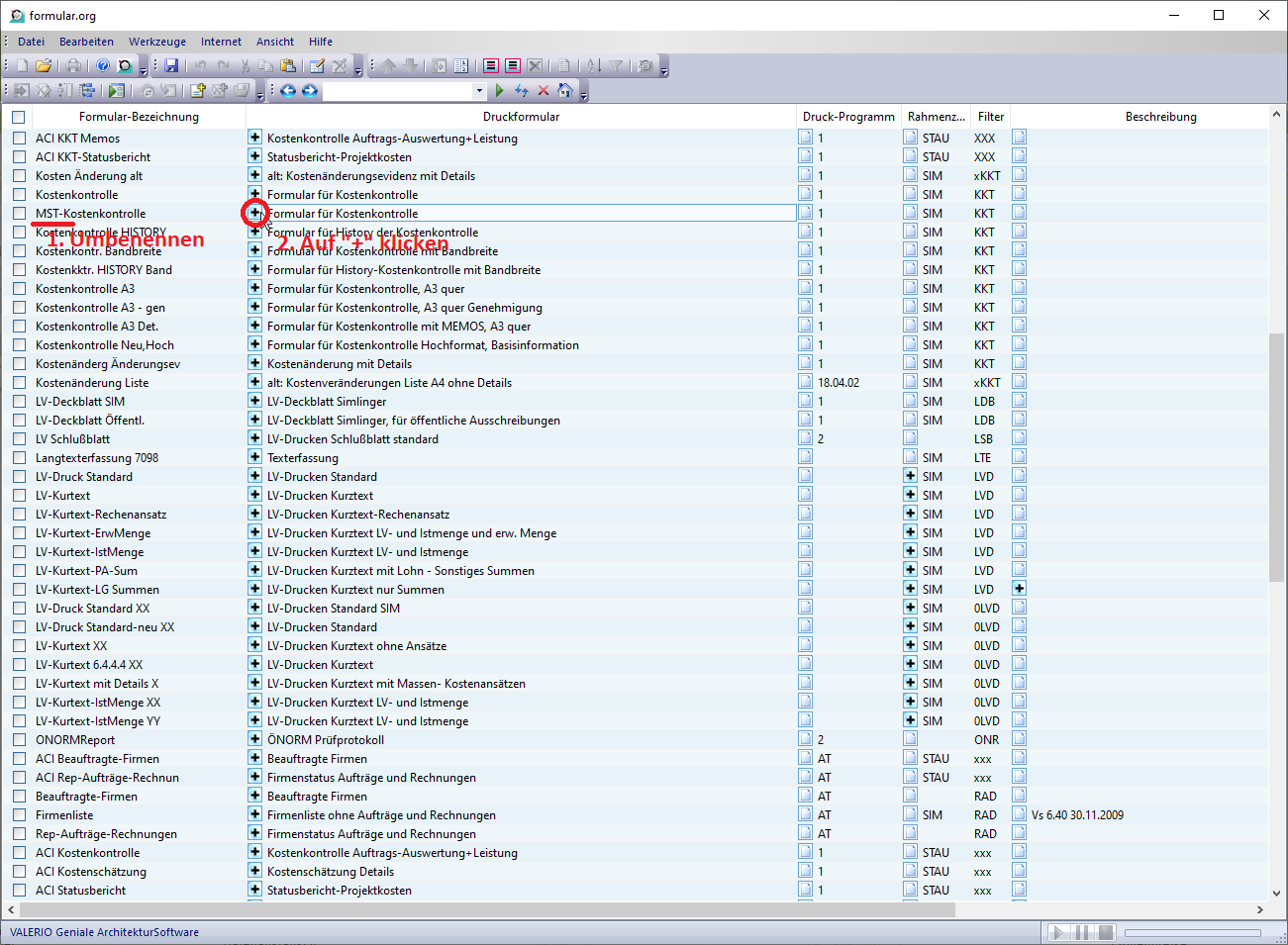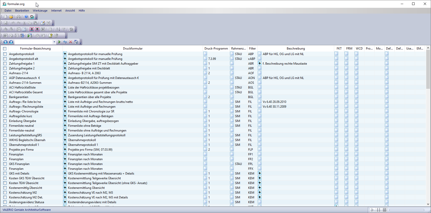 In der ersten Spalte steht der Name des Druckformulars, in der zweiten Spalte die Kurzbeschreibung und in der Spalte „Filter“ ist festgelegt, in welchem Bereich das Druckformular ausgewählt werden kann (KEM steht für Kostenermittlung, KKT steht für Kostenkontrolle, ABR für Abrechnung, etc.).