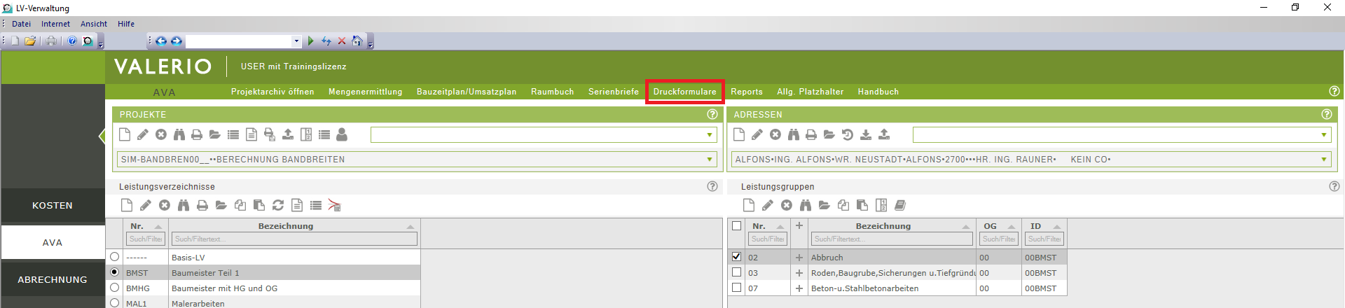 Zum Bearbeiten von Druckformularen klicken Sie auf den Button „Druckformulare“ in der oberen Menüzeile in Valerio.