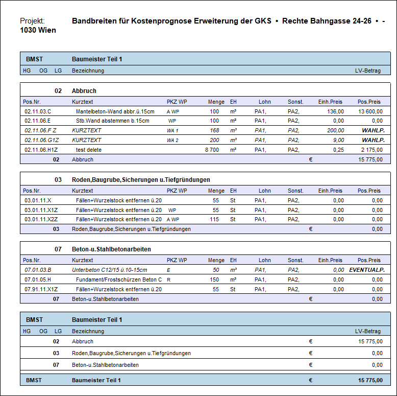 Als Ergebnis erhalten einen LV-Ausdruck mit ihren Schätzkosten, in dem auch die Leistungsgruppensummen und die Gesamtsumme ausgewiesen sind.