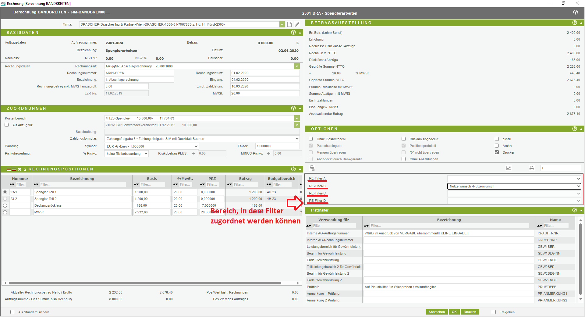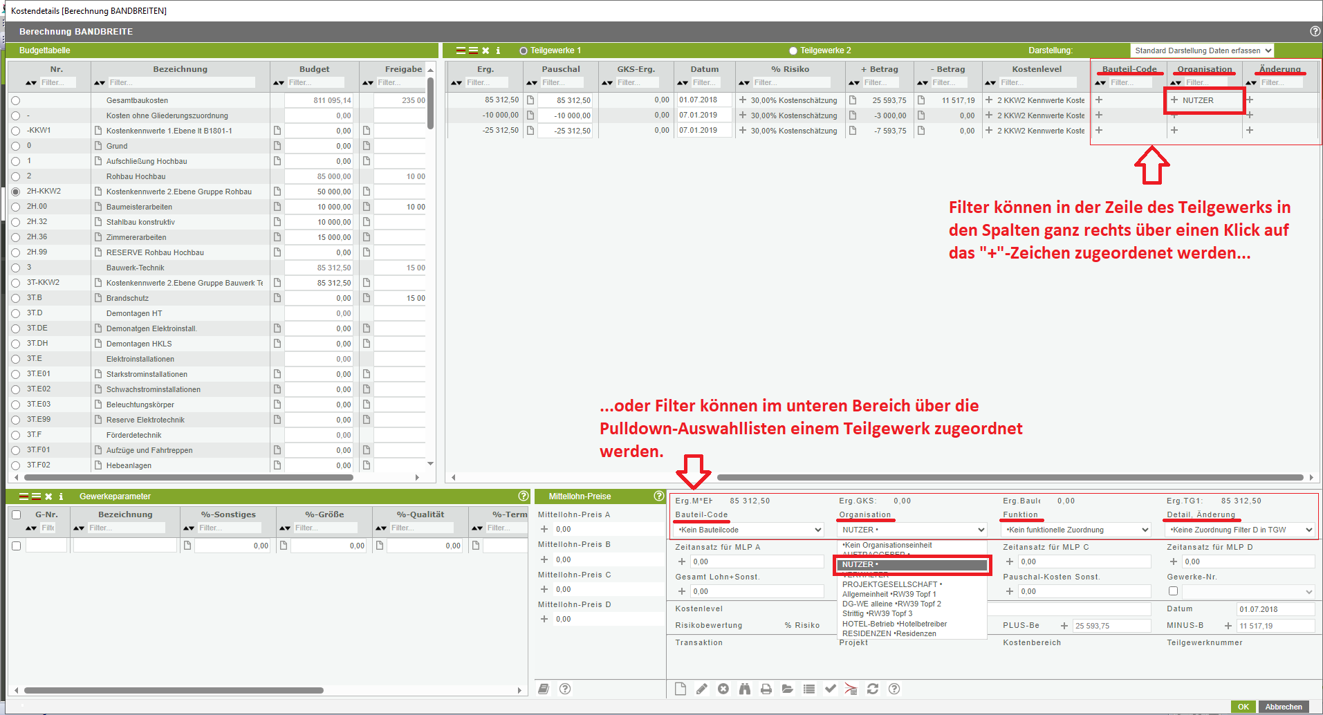 Filter sind vor allem dort sinnvoll, wo die Struktur der Kostenstellen lt. B 1801-1 oder DIN 276 NICHT mehr ausreicht, um Auswertungen eines Projektes vornehmen zu können.