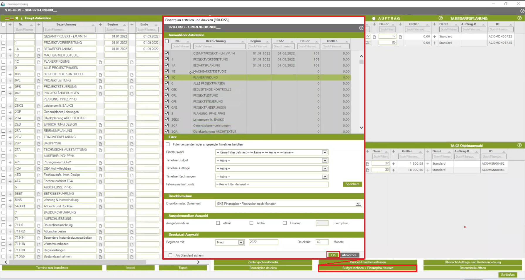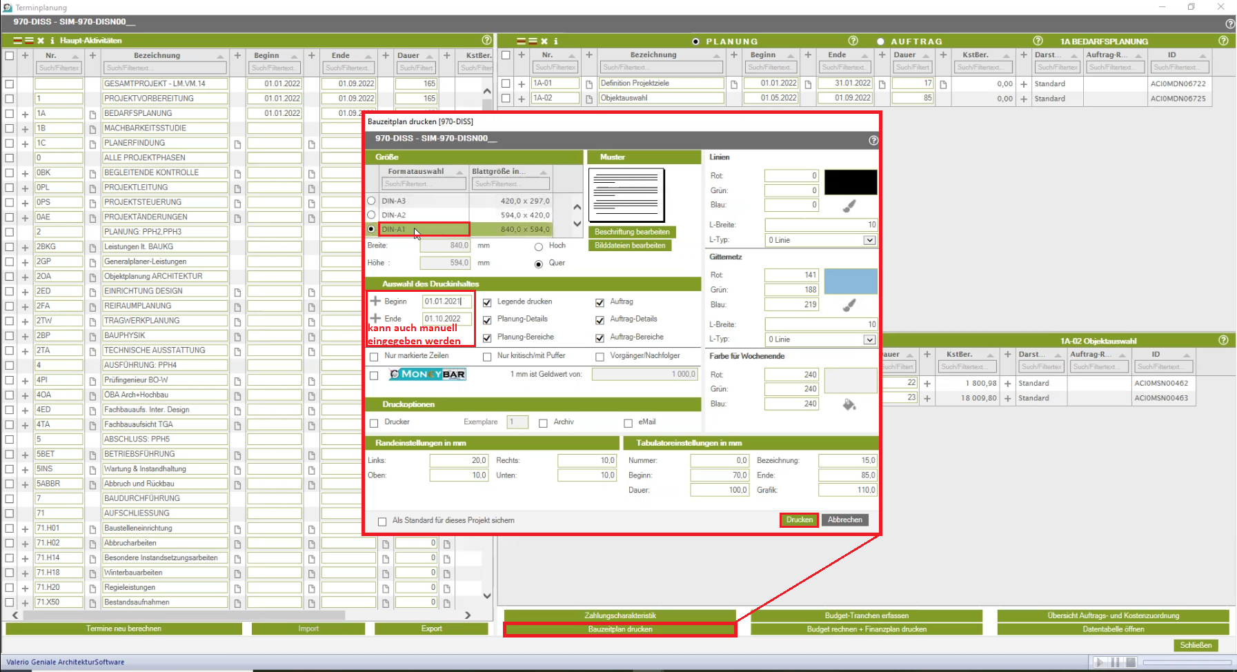 Wenn Sie den Bauzeitplan mit der Umsatzentwicklung ausdrucken möchte, markieren Sie die Auswahl „Money BAR“.