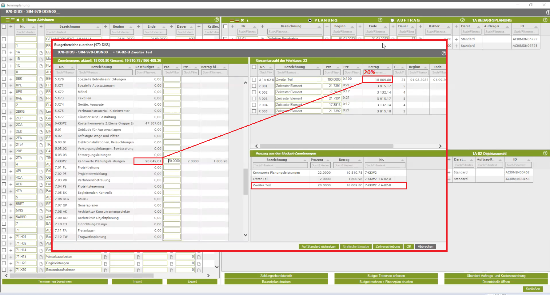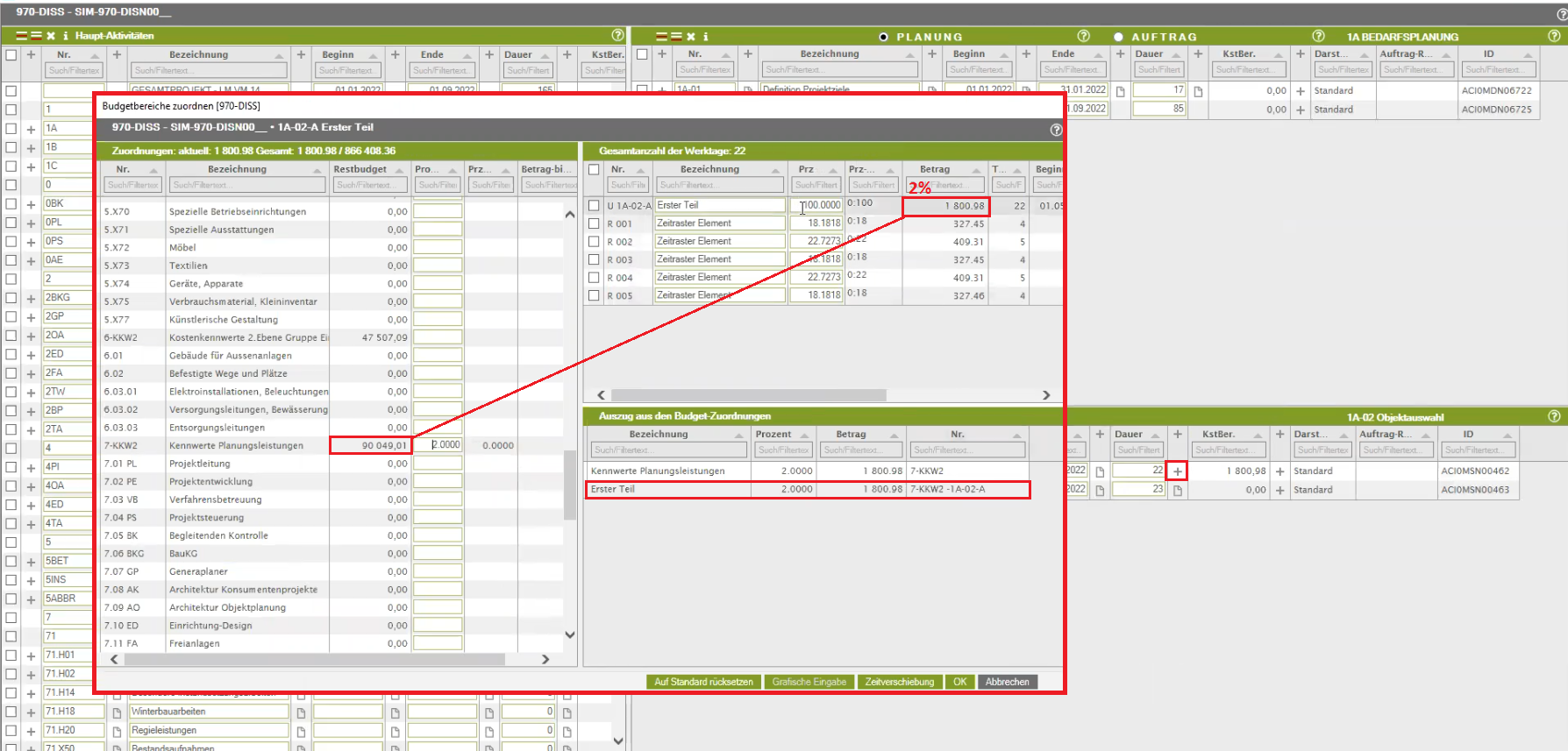 Wie im Beispiel, wird der Betrag (2% aus dem Budgetbereich = 1800,- € für den ersten Teil) im linken Fenster angezeigt und automatisch auf die Wochentage aufgeteilt (Zeitaufteilung). Jedoch können Sie diese Aufteilung auch manuell ändern (vgl. Screenshot unterhalb).
