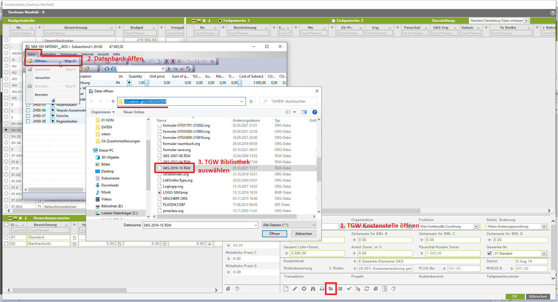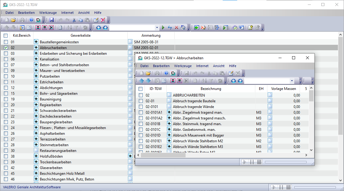 Es öffnet sich nun ein Datenbank-Fenster mit der gewählten TGW-Bibliothek. Über das „+“-Symbol können Sie die jeweilige Leistungsgruppe öffnen. Es öffnet sich nun ein neues Fenster mit den Einträgen in der Leistungsgruppe. Dort können Sie die Werte nun direkt ändern bzw. die Rechendokumente jeweils mit den „+“-Symbolen öffnen und dann die Rechendokumente bearbeiten.