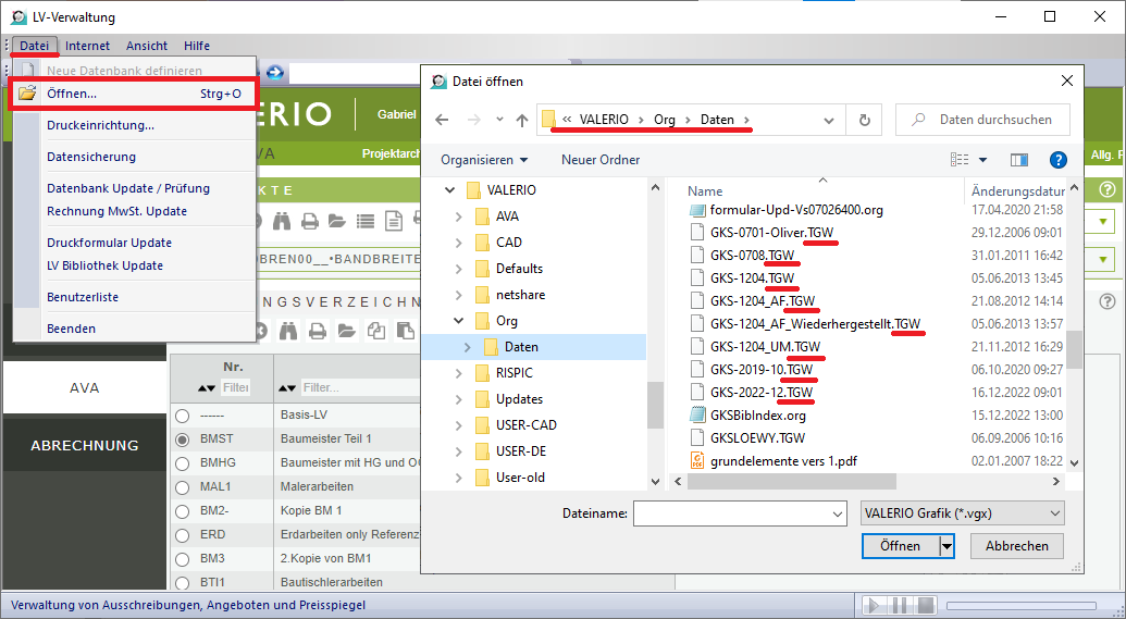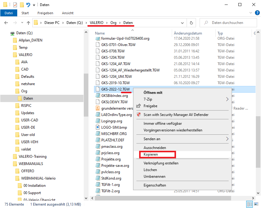 Kopieren Sie eine bestehende GKS-Bibliothek und geben Sie der kopierten Datei einen neuen sinnvollen Namen. Dazu öffnen Sie im Windows Explorer das Verzeichnis „VALERIO/Org/Daten/“. Die bestehenden GKS-Bibliotheken haben die Dateiendung „*.TGW“.
