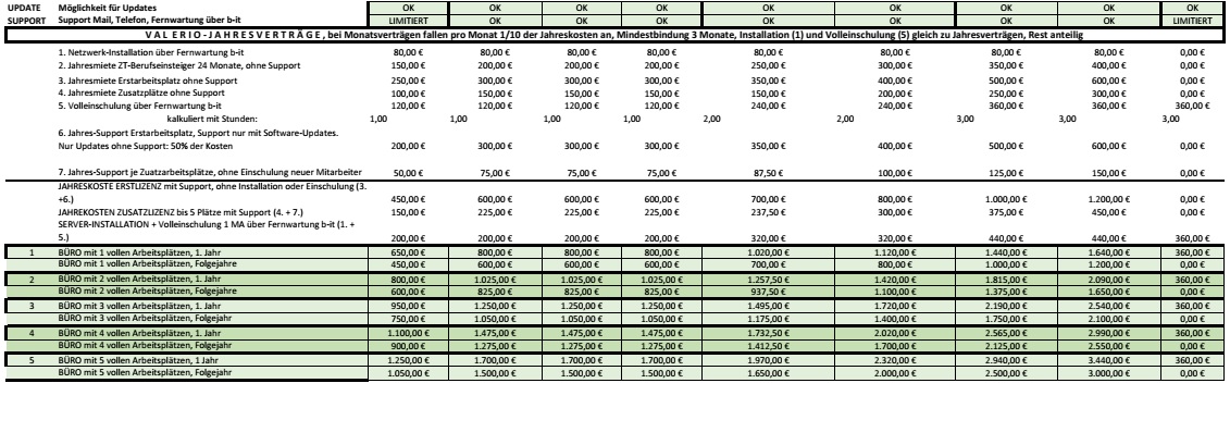 Der Umfang der freigeschalteten Module von Valerio wird durch die Lizenzen bestimmt und kann nach Wunsch frei gewählt werden.