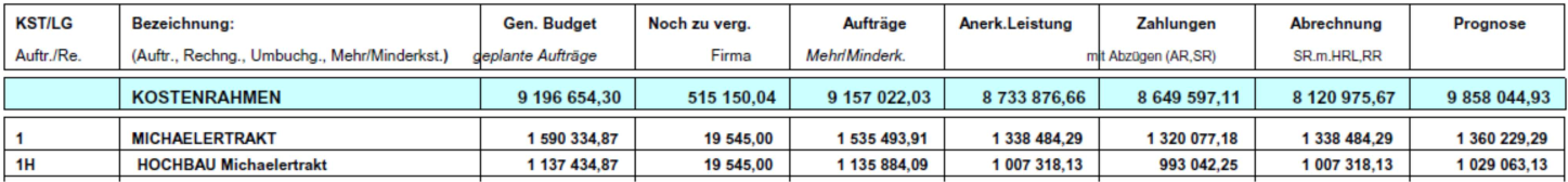 Als „Genehmigtes Budget“ ziehen wir meist die vom AG freigegebene Kostenberechnung des genehmigten Entwurfs heran, die Kostenschätzung des Vorentwurfs hat meist noch zu wenig Aussagekraft für eine gezielte Kostenkontrolle als Grundlage der Projektsteuerung.