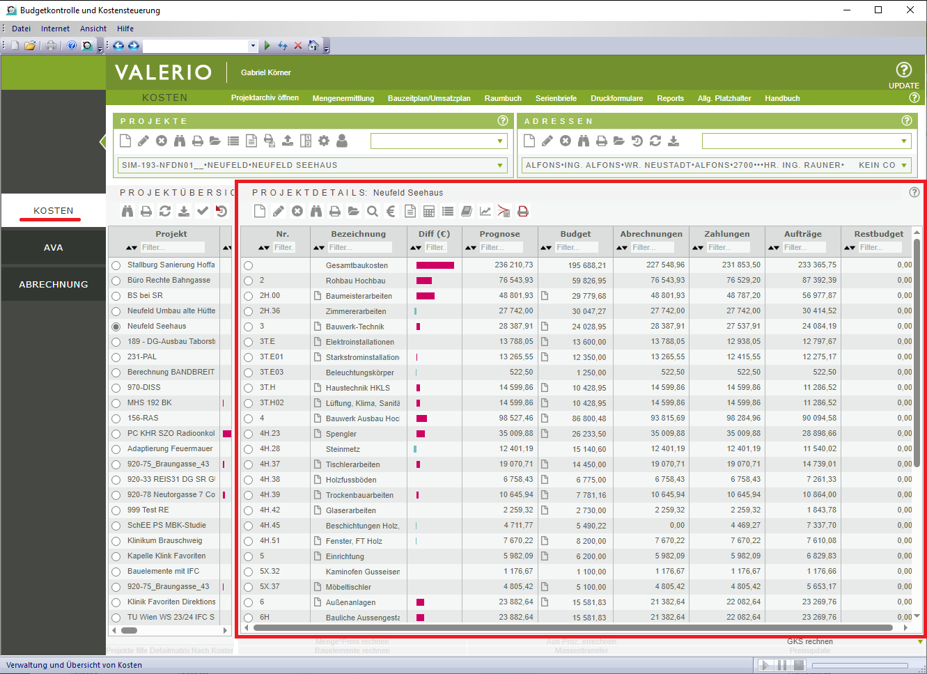 Die Kostenkontrolle selbst wird in Valerio im Modul Kosten gemacht. Dort sehen Sie im rechten Bereich auch die wichtigsten Zahlen für das gewählte Projekt.