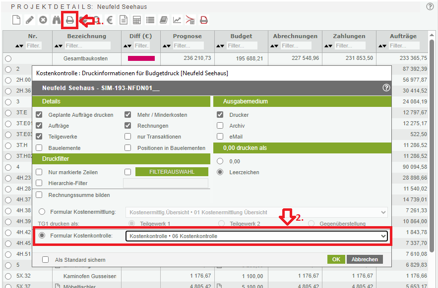 Über das Smybol „Drucken“ können Sie verschiedene Reports zur Kostenkontrolle erstellen, die unterschiedlichem Detailierungsgrad ausgeben werden können. Klicken Sie dazu auf das Drucken Symbol, wählen Sie im Druckfenster zunächst die „Kostenkontrolle aus“ (vgl. Screenshot unterhalb) und wählen Sie aus den zur Verfügung stehenden Druckformularen das für Ihre Zwecke am besten geeignete aus.