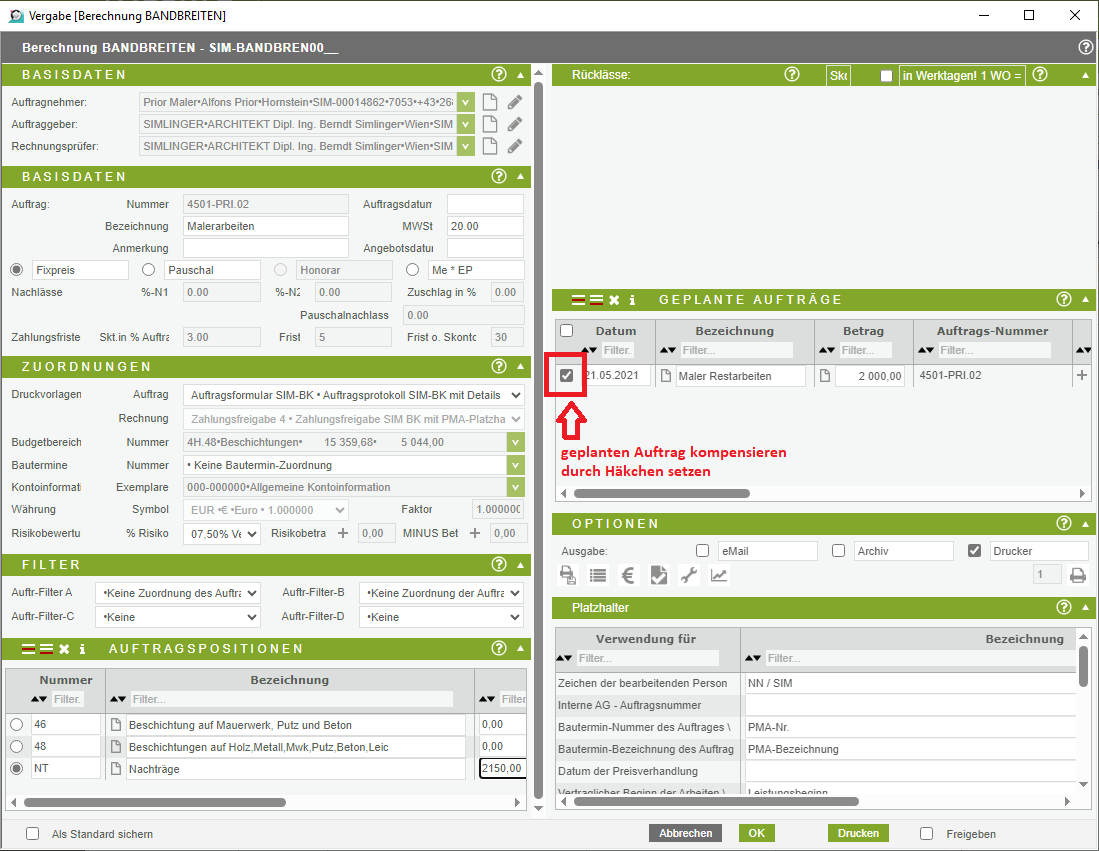 Vergessen Sie nicht, beim Anlagen von Zusatzaufträgen allfällig vorhandene geplante Aufträge zu kompensieren!