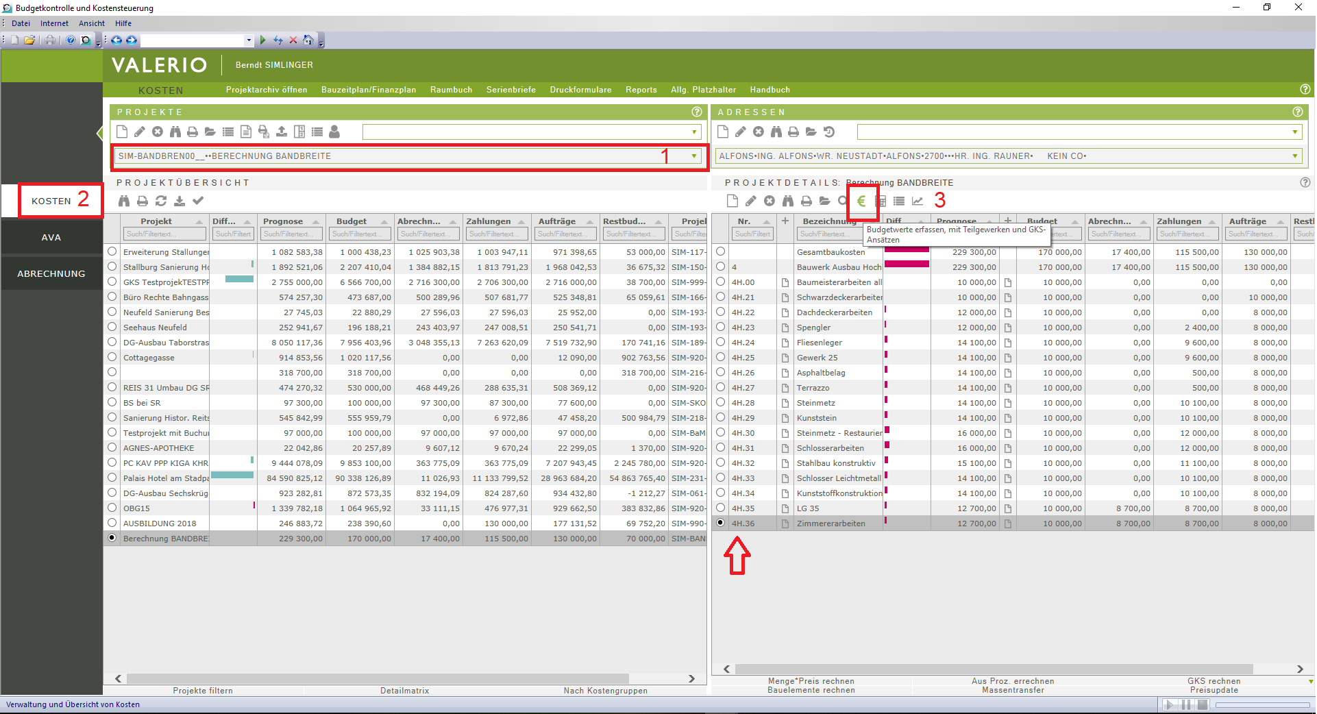Wählen sie in der Maske PROJEKTVERWALTUNG ihr Projekt aus, klicken sie folgend auf das MODUL KOSTEN.