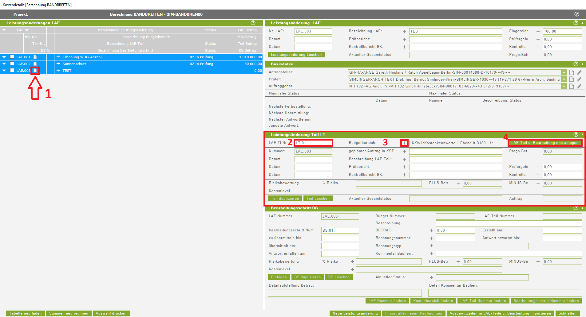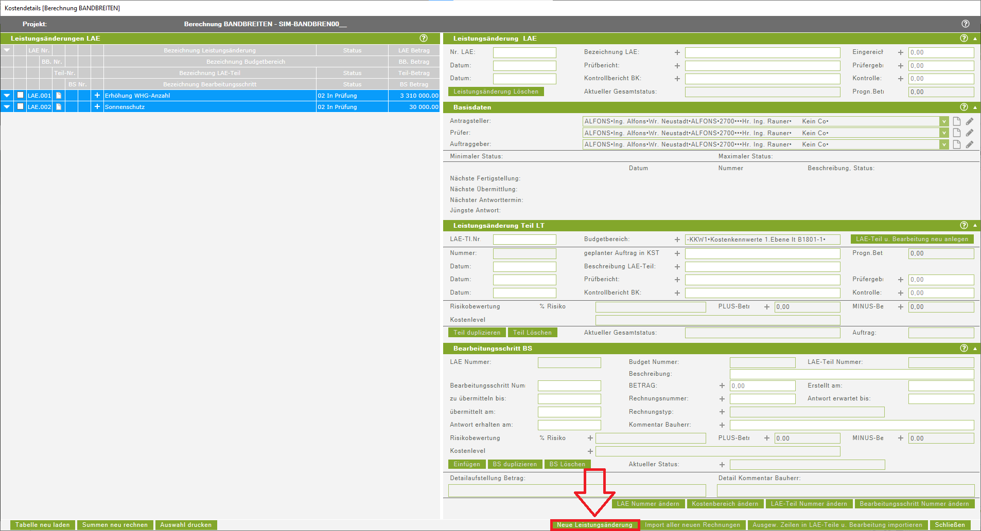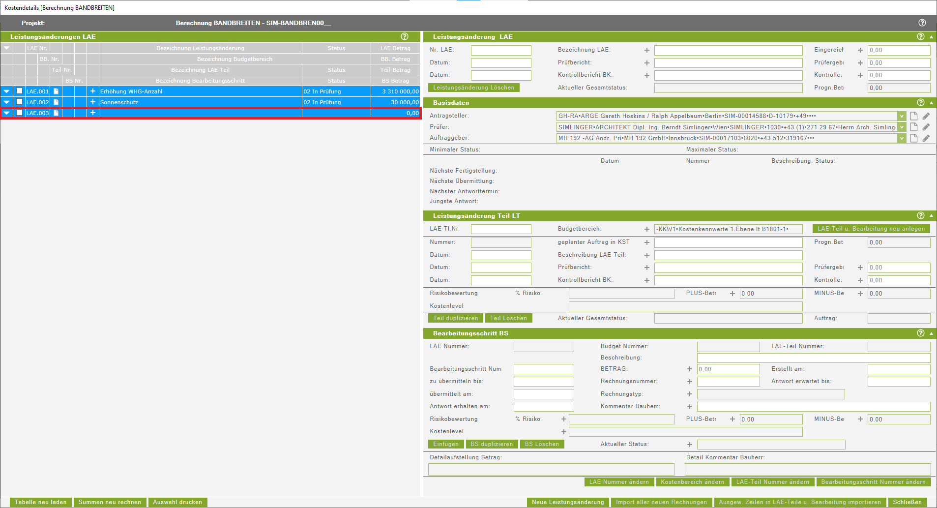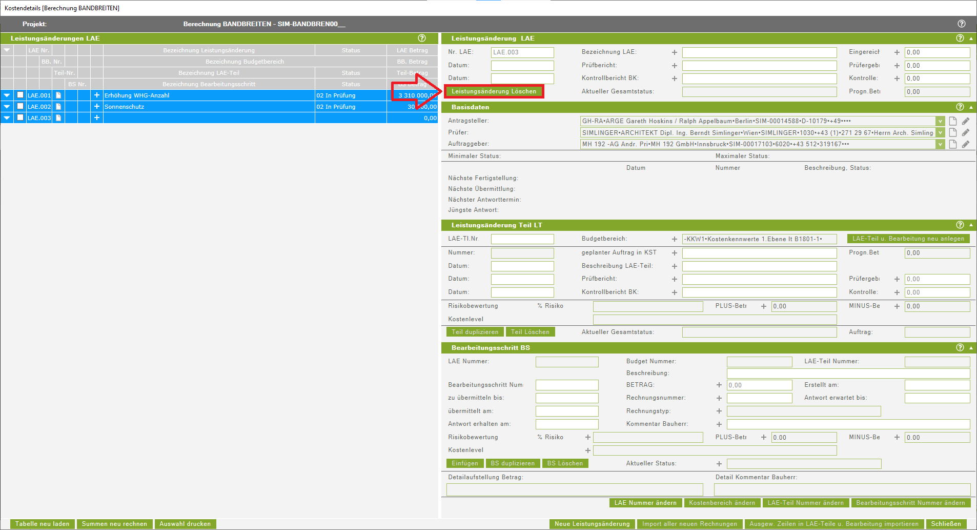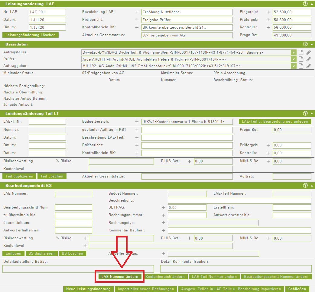 Wenn in einer Teilleistung mehrere Bearbeitungsschritte mit dem Status 09 (in Abrechnung) erfasst werden, gibt es sowohl ein Problem bei der Summenbildung unter Anzeige des aktuellen Betrages eines Leistungsänderungsteiles als auch bei der Berechnung der Kostenprognose. Die Summen bei der Summenbildung werden zum Teil doppelt, zum Teil gemeinsam mit dem Status 08 oder nur der Status erfasst. Daher ist darauf zu verzichten mehrere Stati 09 in einer Teilleistung, sowie mehrere Stati 08 direkt hintereinander zu verwenden. Das Löschen der zusätzlichen BS mit dem Status 09 kann den Fehler wieder bereinigen. Ein Durchrechen sollte nun wieder möglich sein. Sollte in einer Teilleistung bereits der Status 09 enthalten sein und es wird ein zweiter/weiterer Status 09 aufgrund deutlicher Änderungen der Leistungsänderung benötigt, ist eine zweite/weitere Teilleistung anzulegen. In dieser Teilleistung dürfen die Summen der Bearbeitungsschritte nur die Mehr- oder Minderkosten zu der Ursprünglichen Summe enthalten, da sich ansonsten die Gesamtsumme der LAE erhöht. Für die neue Teilleistung sollten wieder die Schritte Freigabe, Auftrag und Abrechnung ersichtlich angelegt werden, um diese klar nachvollziehbar zu gestalten.