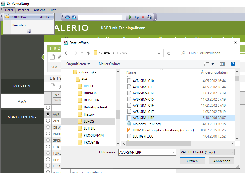 Im ersten Schritt öffnen Sie in Valerio über die Menüzeile ganz oben unter Datei → die gewünschte Bibliotheks-Datentabelle, eine Datei mit der Endung „.LBP“ aus dem Verzeichnis valerio\AVA\LBPOS.