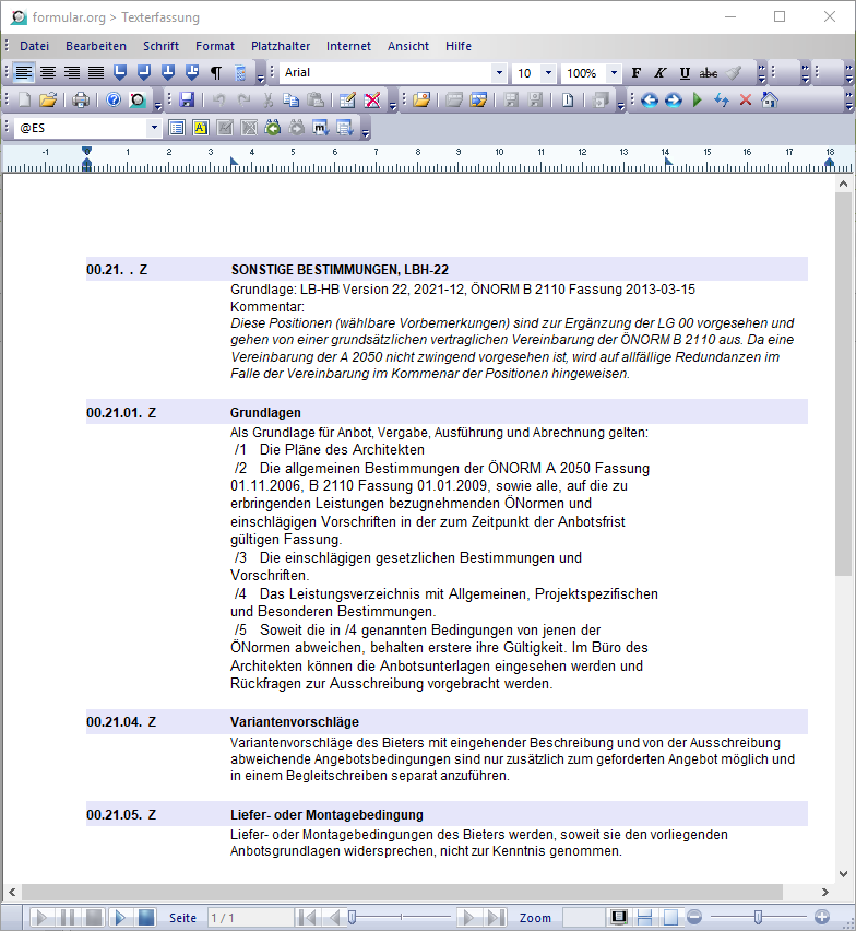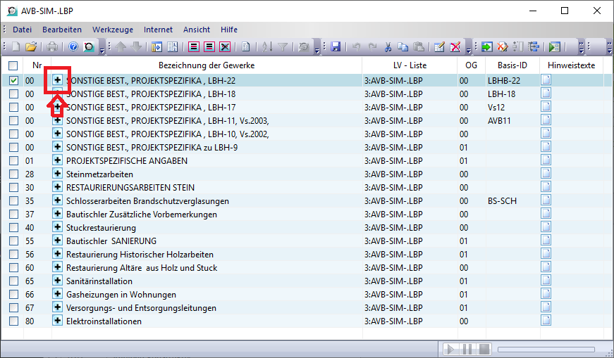 Wenn Sie eine bereits bestehende LB-Bibliothek bearbeiten möchten, können Sie das über die entsprechende Datentabelle machen. Wir raten aber dringend von der Bearbeitung von standardisierten Leistungsbeschreibungen ab. Es gibt aber durchaus selbst angelegte Bibliotheken (z.B. Bürostandards für AVB-Bestimmungen), deren Überarbeitung sinnvoll sein kann. Folgend wird am Beispiel von Büro-Standard-AVB gezeigt, wie eine Bearbeitung funktioniert, inkl. des Einfügens von internen Kommentaren.