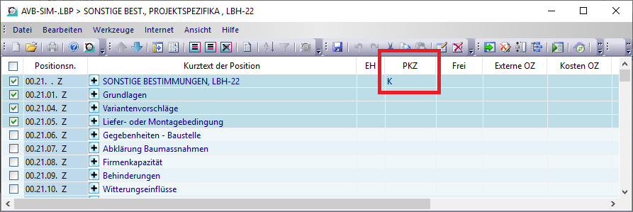 In der Positionsliste werden Positionen mit Kommentare mit einem „k“ in der Spalte PKZ gekennzeichnet.
