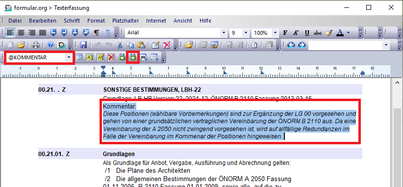 Um einen neuen Kommentar einzufügen, gehen Sie ans Ende des Platzhalters „Langtext“ und fügen Sie dort einen neuen Platzhalter „@Kommentar“ ein. Nun können Sie mit einem freien Text den Platzhalter befüllen. Sie können diesen Text auch formatieren, z.B.: kursiv stellen oder mit einer Hintergrundfarbe farblich hervorheben.