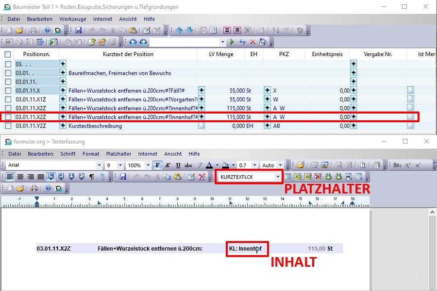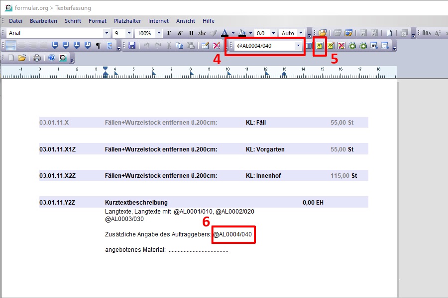Um eine Ausschreiberlücke hinzuzufügen, wählen Sie aus der Platzhalterliste den Platzhalter @AL0001/010 aus und klicken Sie auf die Schaltfläche „Platzhalter hinzufügen“. Die Bieterlücke können Sie mit dem Platzhalter @BL0001/012 hinzufügen. Beachten Sie, dass die Platzhalter von Ausschreiber- und Bieterlücken fortlaufend nummeriert sind. Pro Position sind bis zu 5 Ausschreiber- und 5 Bieterlücken möglich.