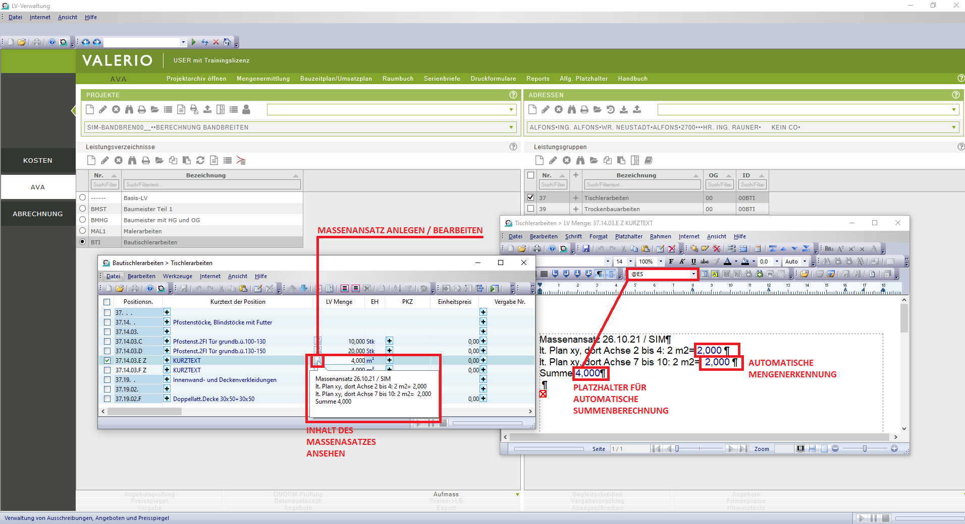 In Spalte „LV-Menge“ können Sie direkt eine Zahl eingeben. Besser ist allerdings das Anlegen eines Rechendokuents. Mit einem Rechendokument können Sie die Mengenermittlung nachvollziehbar durchführen. Klicken Sie dazu auf das „+“-Zeichen in der jeweiligen Positionszeile links in der Spalte „LV-Menge“.